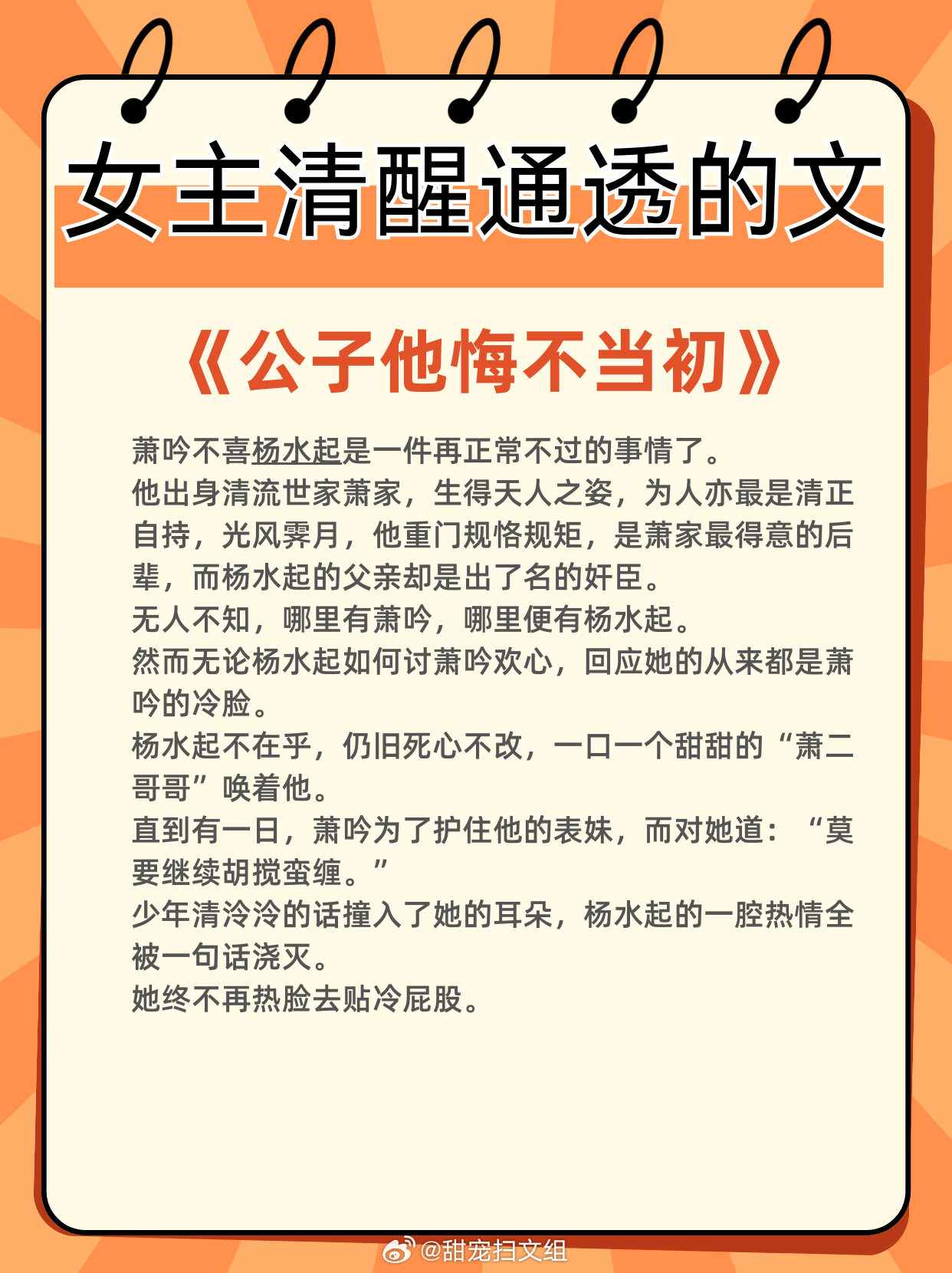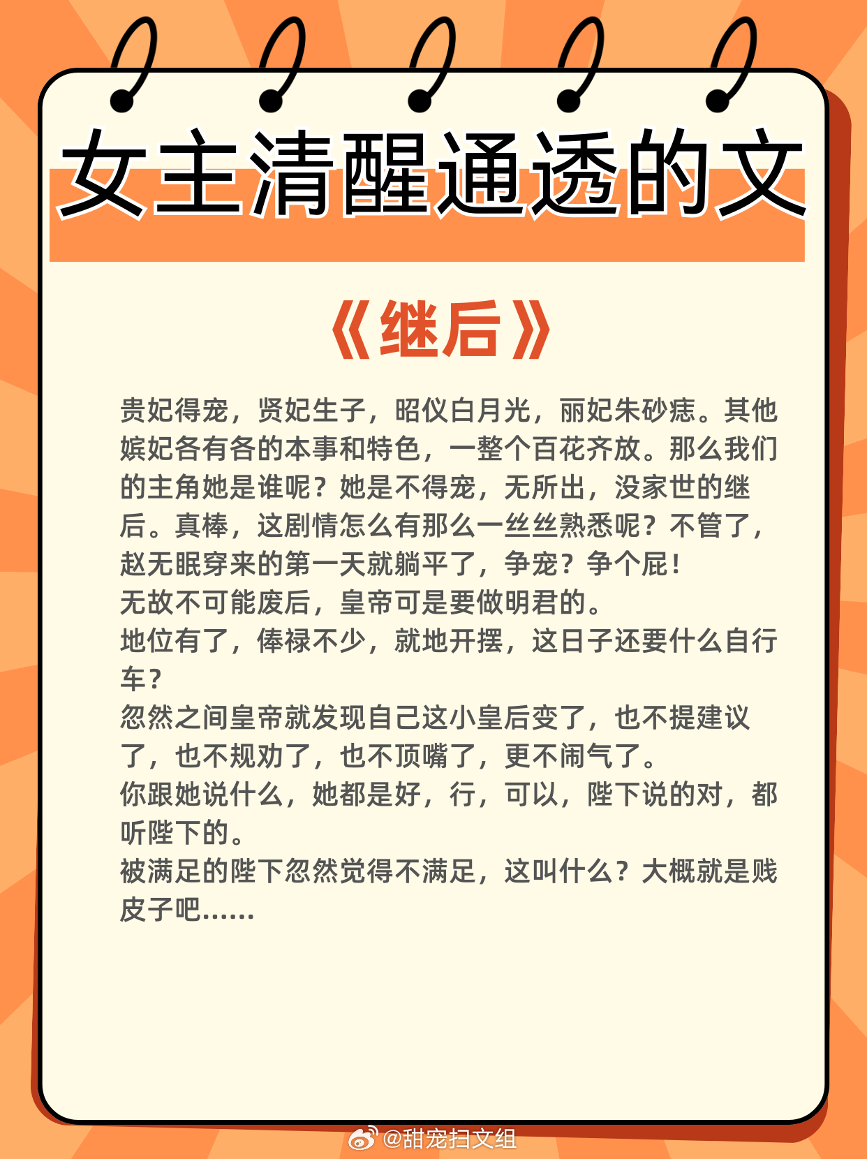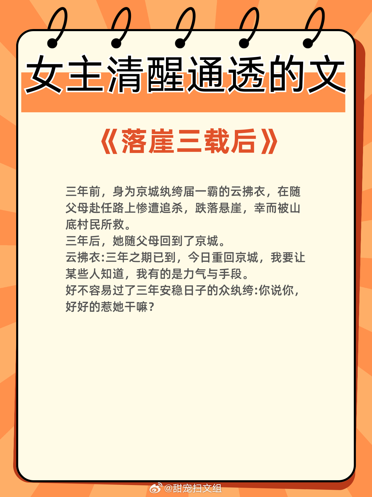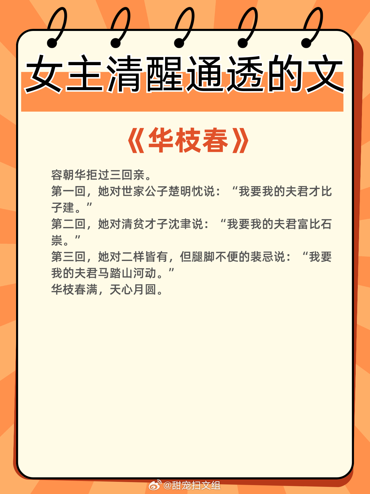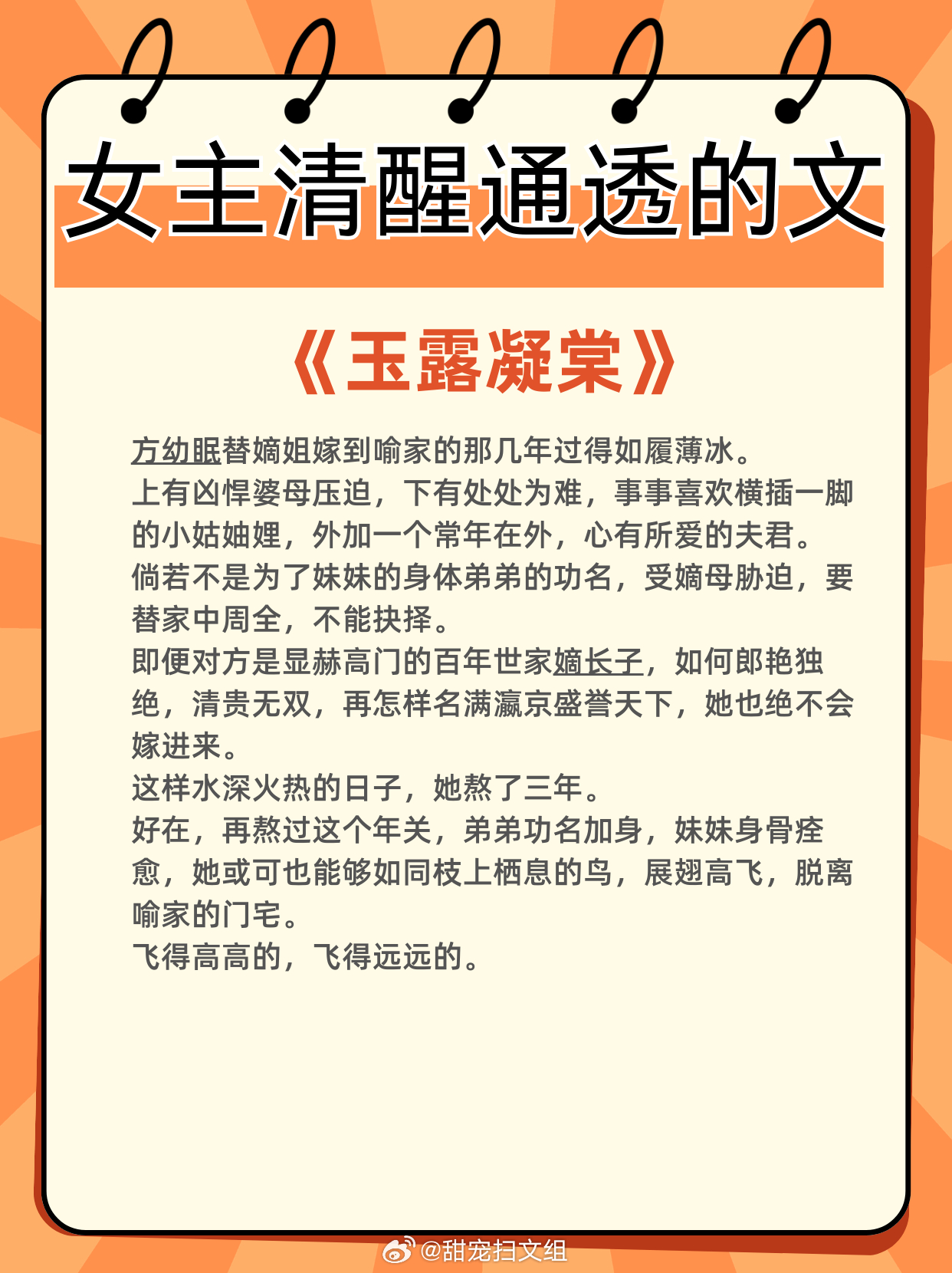 女主清醒通透的文,全程智商在线!专注自我成长,经营美好生活1、《落崖三载后》作者:月下蝶影2、《贵妃娘娘荣华富贵》作者:鹊上心头3、《华枝春》作者:怀愫4、《公子他悔不当初》作者:二十天明5、《玉露凝棠》作者:一枝嫩柳6、《继后》作者:菜汪汪那些让我着迷的小说 这本小说超绝