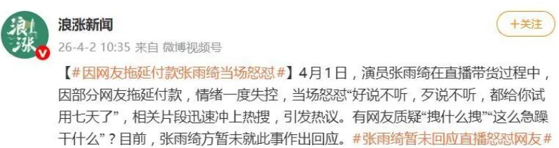 不懂张雨绮她骂的到底是哪一部分人? 1.在直播间后台下单了还没付款也不会发货的那种, 2.还是使用了先用后付,货到手里了没点收货没付款呢? 感觉第一种对她没什么影响啊,顶多是玩儿心态了。第二种是早晚会付款啊。急什么呢? 不管怎样都不能怼买家,尤其是公众人物,混到卖货了还装。 现在的演员都想直播,跟贾乃亮,根本记不得他演了什么电视,只记得321上车。