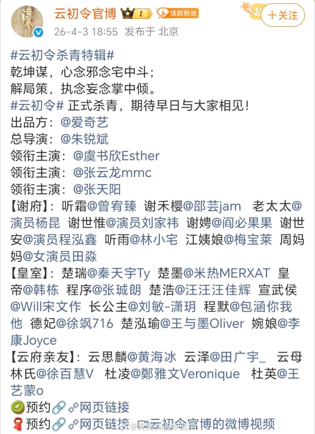 虞书欣《云初令》杀青照来咯这个阵容太牛批了,还得是舒心👍