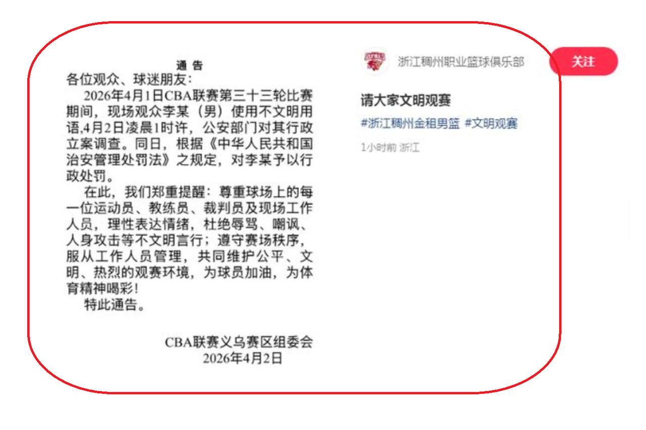 浙江队:球迷李某已经被公安部门行政立案调查! 刚刚,浙江队官方直接发了通告,一则消息瞬间在球迷圈炸开了锅——4月1日比赛现场的球迷李某,因为在看球时使用不文明用语,已经被公安部门行政立案调查了!说真的,这波操作太解气,也给所有球迷敲了个警钟。 估计不少球迷都有印象,4月1日浙江队的那场比赛,现场氛围本来就挺激烈,没想到出现了不和谐的一幕。有球迷当时就拍到,看台上有位观众情绪比较激动,嘴里一直骂骂咧咧,用了不少难听的不文明用语,当时就有不少现场球迷觉得不妥,还出面劝阻过,可对方根本不听。 本来大家以为,这事顶多就是被现场工作人员警告一下,或者浙江队后续发个通报批评就完了,没想到这次来真的。浙江队官方通告说得明明白白,事情发生后,他们第一时间就把相关情况反馈给了公安部门,经过调查,球迷李某的行为已经构成违规,目前已经被行政立案调查,后续就等公安部门的进一步处理结果了。 其实最近这阵子,体育赛事里的不文明观赛行为真不少,之前CBA就有球迷投掷水瓶、辱骂球员被处罚的情况,甚至还有球迷围堵球队大巴的事,扰乱了赛事秩序不说,还影响了主场形象。而且现在新修订的治安管理处罚法,对这种扰序行为处罚更重了,情节严重的不仅要罚款,还可能被拘留,甚至被禁止一段时间内进入场馆看球。 有球迷说,李某这就是咎由自取,看球就看球,输赢都是正常的,没必要用不文明用语发泄情绪,既丢自己的人,也给浙江球迷招黑。还有球迷表示,浙江队这次做得太对了,就该严肃处理,杀一儆百,不然以后不文明观赛的行为只会越来越多。 说句实在的,看球图的就是个热闹、开心,支持自己喜欢的球队没问题,但前提是要守规矩、讲文明。不管是球员还是球迷,都得守住底线,不能因为一时冲动就做出违规违法的事。希望这次李某的事,能给所有球迷提个醒,文明观赛才是真球迷该有的样子,也希望以后赛场能少点不和谐,多点正能量。