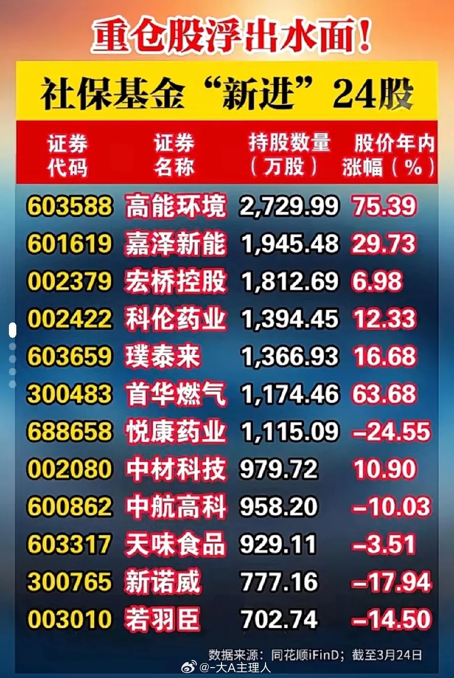 国家队出手!社保基金24只新进重仓股名单曝光,跟着国家队抄作业的机会来了!截至3月24日,社保基金最新新进的24只重仓股浮出水面,覆盖新能源、医药、消费、公用事业等多个赛道。从持仓规模来看,高能环境以2729.99万股的持股量位居榜首,年内涨幅更是高达75.39%,成为社保基金布局的大热门;嘉泽新能、宏桥控股紧随其后,持股量均超1800万股。个股表现分化明显,除高能环境外,首华燃气(63.68%)、健盛集团(26.89%)、首都在线(25.10%)等标的年内涨幅亮眼,也有部分个股处于低位布局区间。社保基金作为市场风向标,其持仓动向一直是投资者的重要参考。这份完整名单,帮你快速锁定国家队的最新布局方向,把握中长期投资脉络。⚠️ 以上内容仅为信息整理,不构成任何投资建议,股市有风险,投资需谨慎。