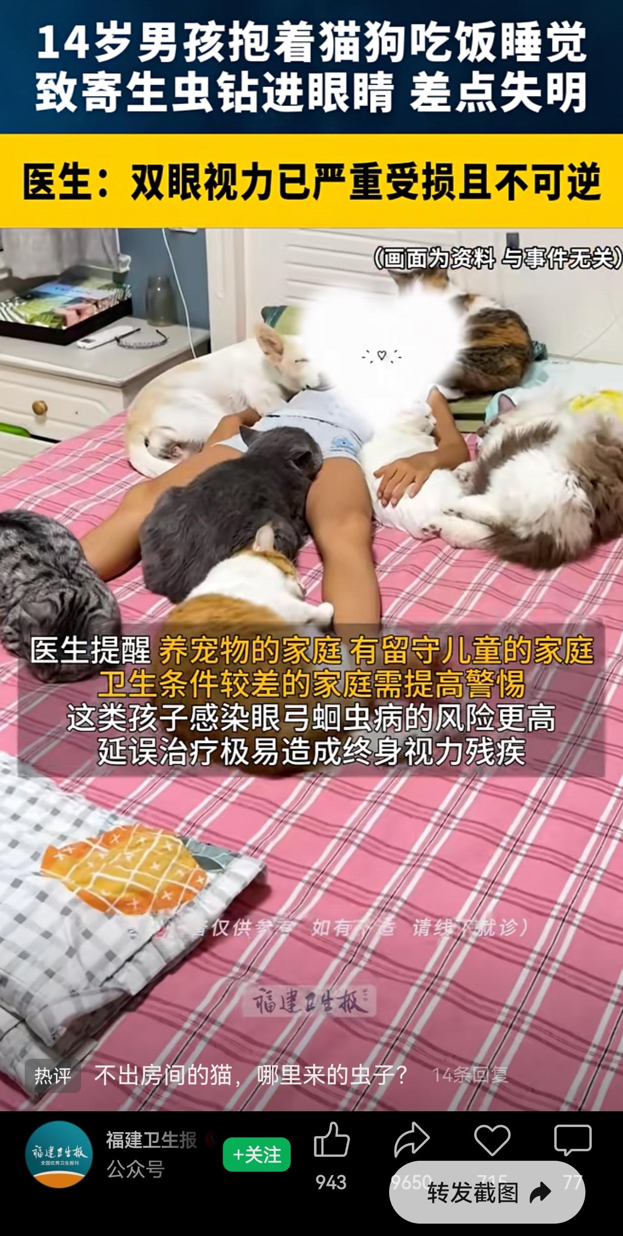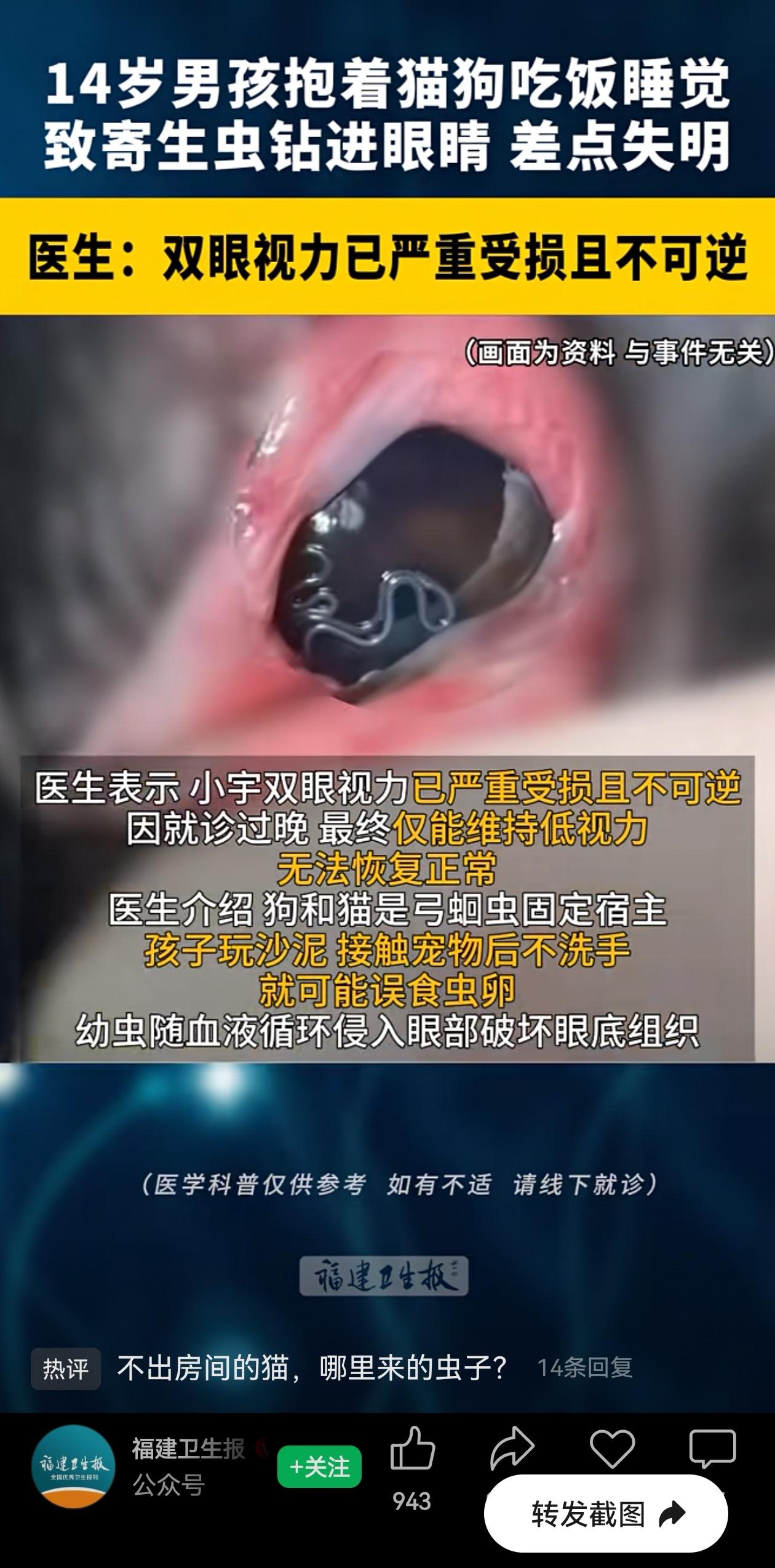 太惋惜啦!福建一个14岁的男孩,平时跟自己家里的土猫土狗太亲近,经常在一起睡,再加上挖完土以后,吃饭前也不洗手,眼睛差点失明。 现在眼睛的视力,一只眼睛0.1,一只眼睛0.2,虽然最后眼球保住了,但视力已经严重受损,痛心的是,医生说已经不可逆了! 心酸啊!孩子爸妈都在外面打工,平时爷爷奶奶带。孩子视力模糊持续了一年多后,才给父母打电话。 等爸妈赶回来带去医院,才知道是弓蛔虫感染,虫卵从嘴里进去,跑到眼睛里把眼底组织破坏了,而且治疗太晚,已经医不好了! 所以说勤洗手真的不是穷讲究!爷爷奶奶带孩子,应该是觉得“脏点没事,哪那么娇气”。结果呢?后悔都来不及了。 很多人觉得“小孩糙养好”,可眼睛就这么一双,坏了就是一辈子。猫狗再干净也可能带虫,何况还是土猫土狗,摸完不洗手,还一起睡? 14岁,正是读书、奔跑、看世界的年纪,却因为一个“懒得洗手”的疏忽,再也看不清了。太惋惜了! 抱着宠物睡觉、脸贴着脸、让宠物舔手舔脸,甚至跟宠物一起吃饭。这些看着亲密的动作,造成的后果实在太可怕了! 才14岁啊,眼睛就近乎失明了,想想都心疼。 爱自己的宠物没问题,但摸完猫狗后,该洗手还是洗吧,千万别偷那一下懒。 如果不敢保证宠物绝对干净的话,那就别跟它们一起睡了。 搂着睡是挺暖和的,可虫卵这东西看不见摸不着,万一中招,一辈子后悔都来不及。为了这份安心,洗完手再吃东西,不亏吧? 信息来源:福建卫生报