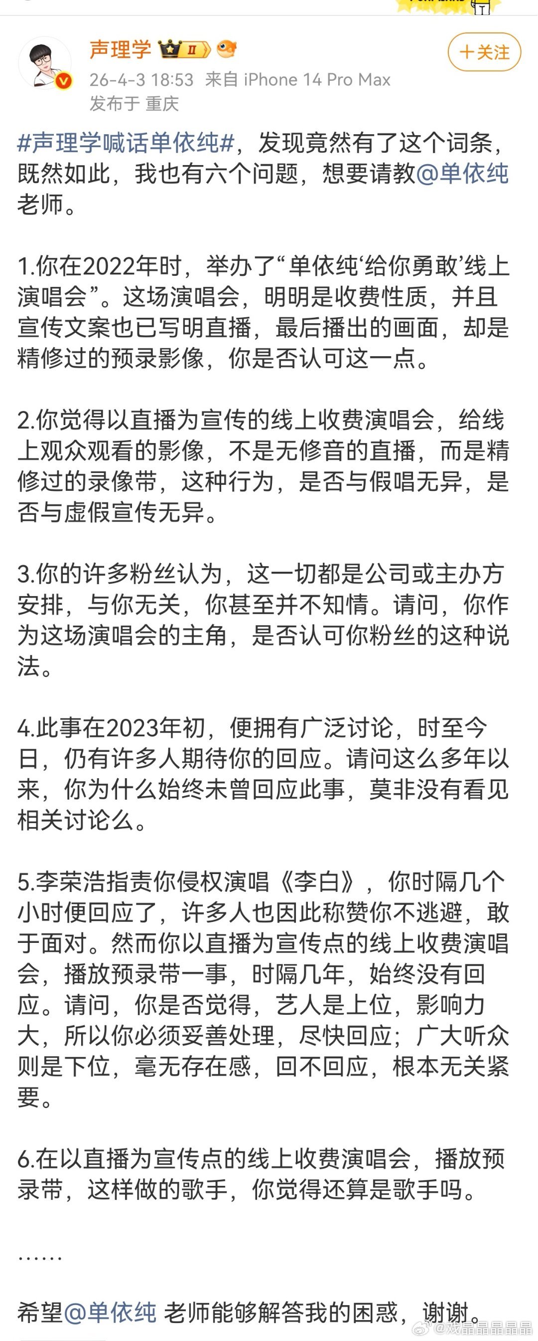 声理学喊话单依纯声理学喊话单依纯,问她在2022年的线上演唱会是否假唱?