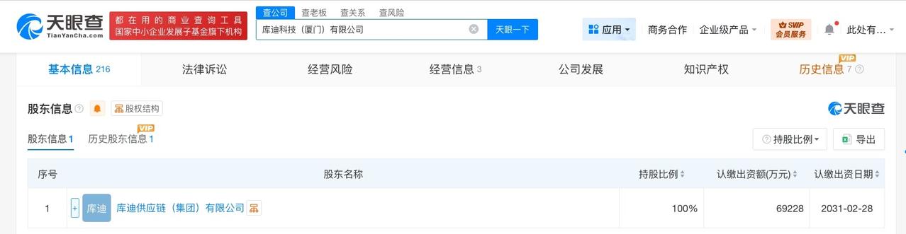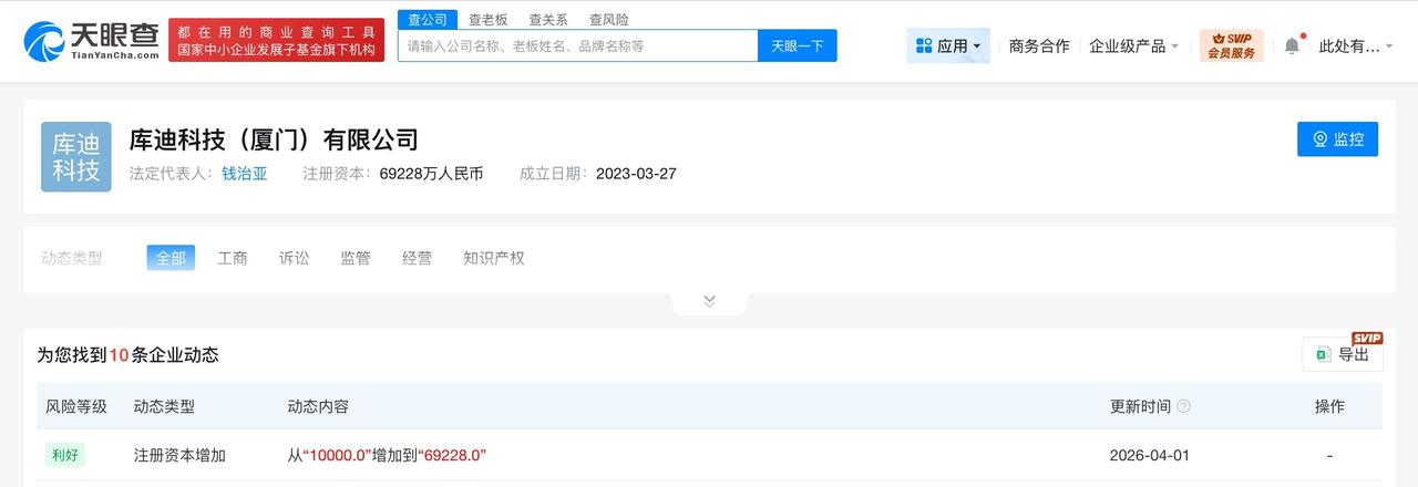 库迪咖啡旗下厦门科技公司增资至6.9亿 增幅约692% 天眼查工商信息显示,近日,库迪科技(厦门)有限公司发生工商变更,注册资本由1亿人民币增至6.9亿人民币,增幅约692%。 该公司成立于2023年3月,法定代表人为钱治亚,经营范围含科技推广和应用服务、软件开发、信息技术咨询服务、信息咨询服务、企业管理咨询、企业管理、食品互联网销售等。股东信息显示,该公司由库迪咖啡旗下库迪供应链(集团)有限公司全资持股。 天眼查信息: