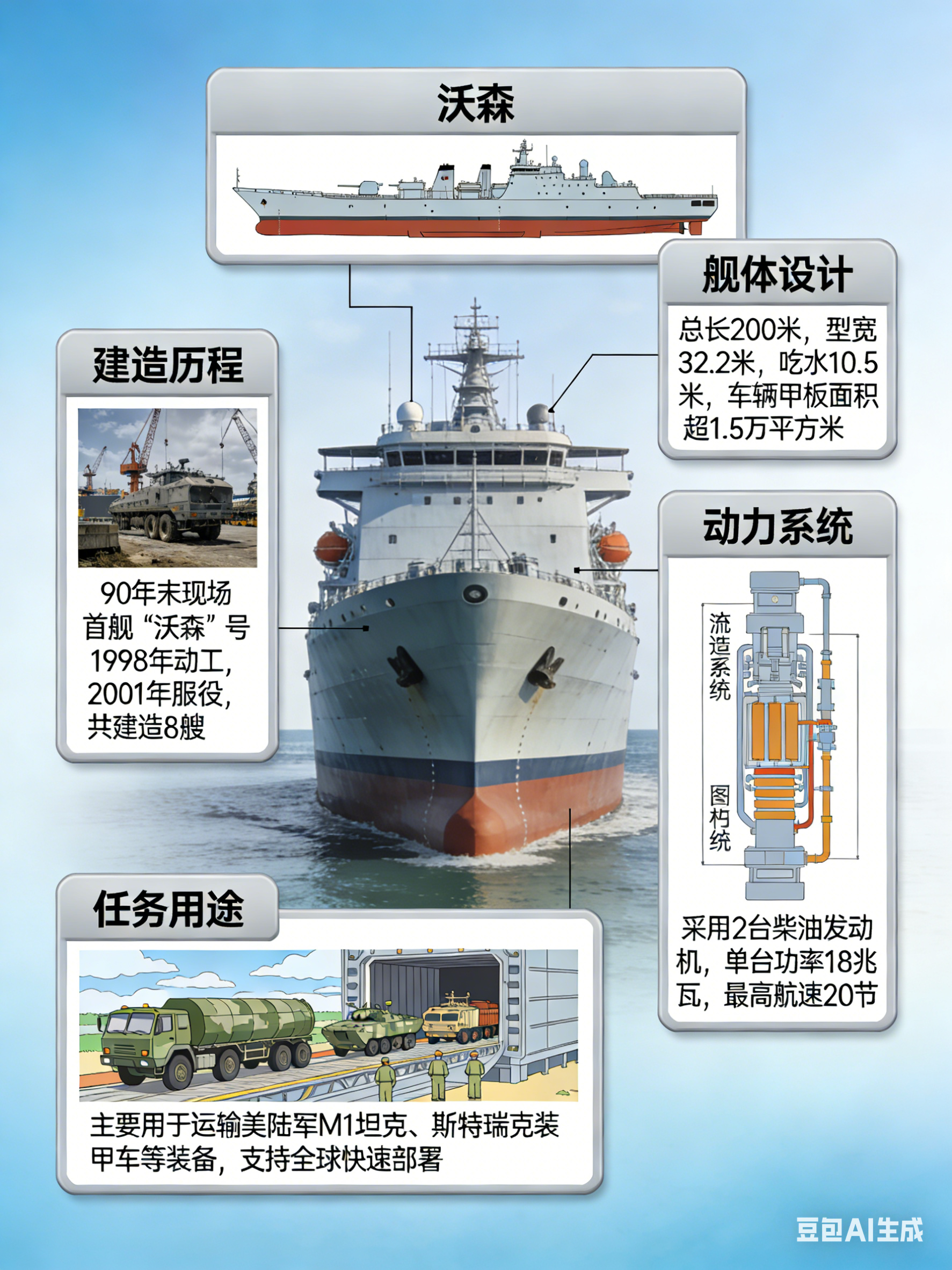 “沃森”级车辆运输船是美国军事海运司令部所属的19艘大型中速滚装船中的核心成员,也是执行战略预置任务的33艘运输舰中的一员。