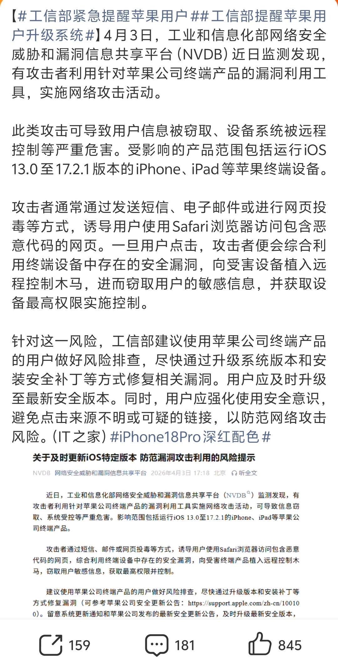 工信部紧急提醒苹果用户 运行 iOS 13.0 至 17.2.1 版本的 iPhone、iPad 等苹果终端设备要注意了!有黑客利用这些版本的漏洞进行攻击,有可能导致用户信息被窃取、设备系统被远程控制等严重危害!用苹果的快看看你现在的系统版本是多少?