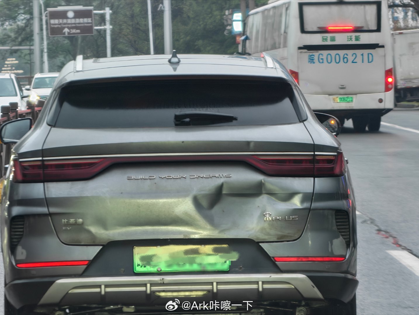 这辆比亚迪宋Plus是被一辆摩托追尾了吗,感觉后方有点惨重啊智驾数码团