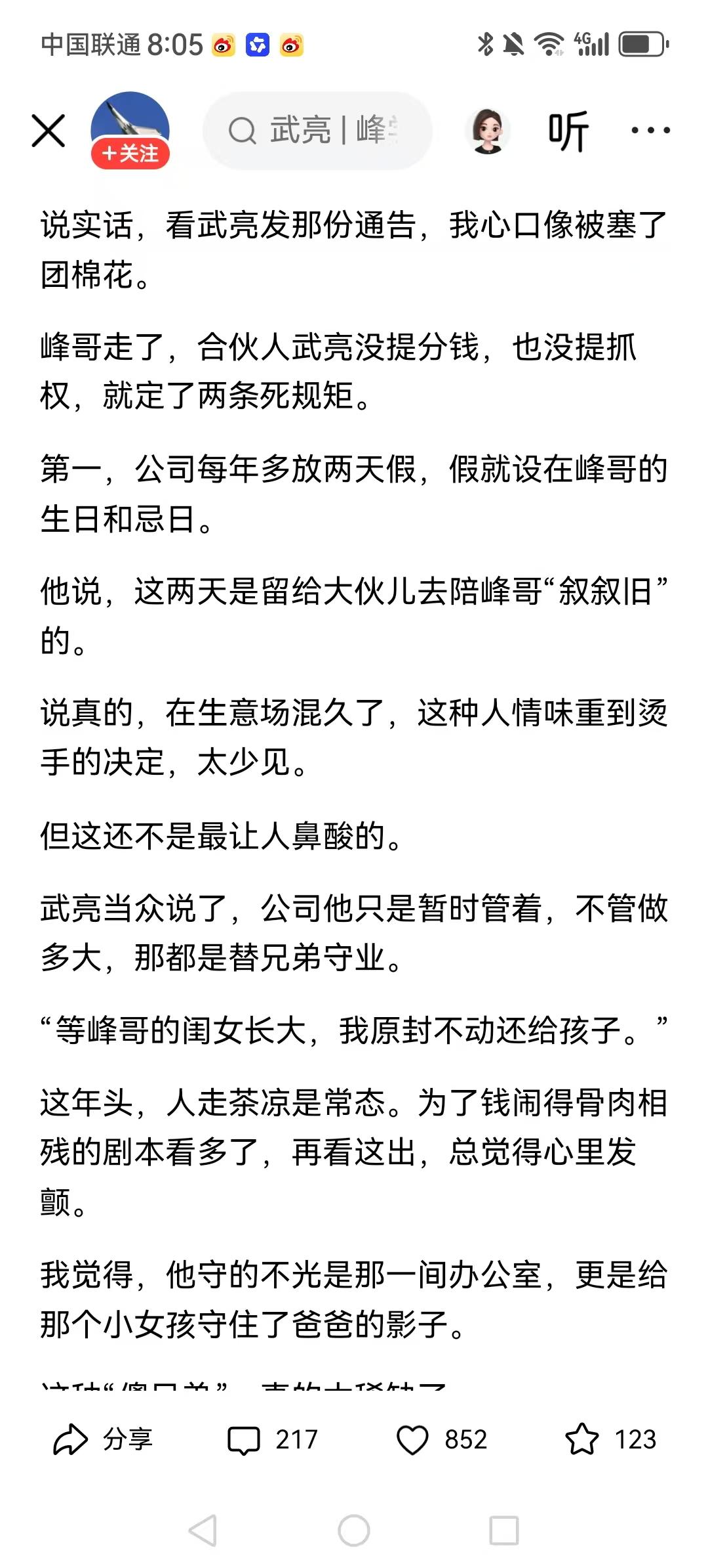 合伙人武亮发通告承诺交还公司,但商业信誉的重建比承诺更难。核心用户和团队是否留下,才是真正的考验。 人走茶凉是常态,雪中送炭才难得,他守的不是公司,是兄弟的情分,是孩子的未来。 等孩子长大,公司现在的业务模式可能都不在了。好好管理公司,保证充足的现金流,希望能给员工和孩子稳妥的保障。 全网找不出几个这样的真兄弟了!不谈钱不抓权,只守着兄弟的托付,还给孩子留着爸爸的心血,武亮这波操作,把情义二字刻到骨子里了! 世人慌慌张张,不过图碎银几两,偏这碎银几两,能压垮情义脊梁。可总有人,守着情义,忘了银两。 在商言商,他如果真的这样说,那是为了维持张雪峰的影响力让消费者继续信任公司。 有人情味可减少员工离职率,稳定企业发展,有人情味儿更接地气。 真正负责任的人,不会轻易许诺什么,因为只有实际行动才是最好的诺言。