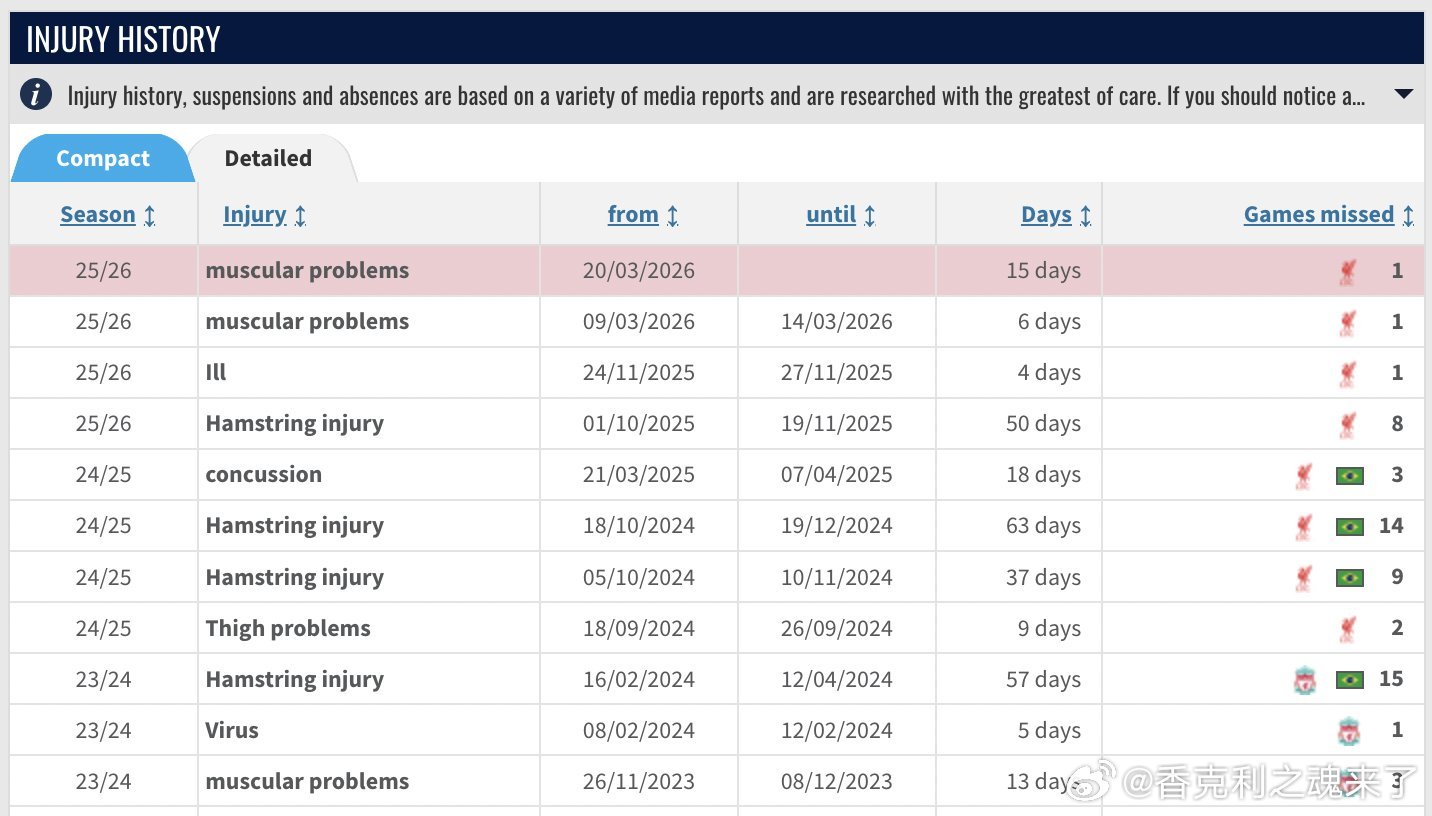 根据Transfermarkt上关于阿利森伤病记录的数据,这是他过去三个赛季中第