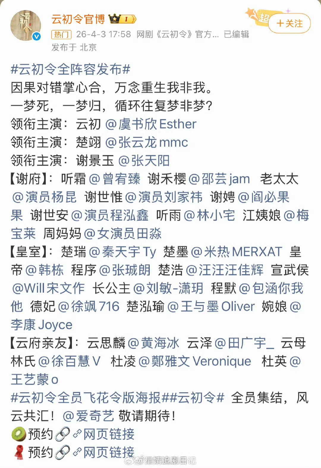 《云初令》全阵容领衔主演:虞书欣领衔主演:张云龙领衔主演:张天阳 ……云初令全阵容来袭,主母宅斗,能吸引到大家嘛? 云初令全阵容发布,虞书欣云初令海报