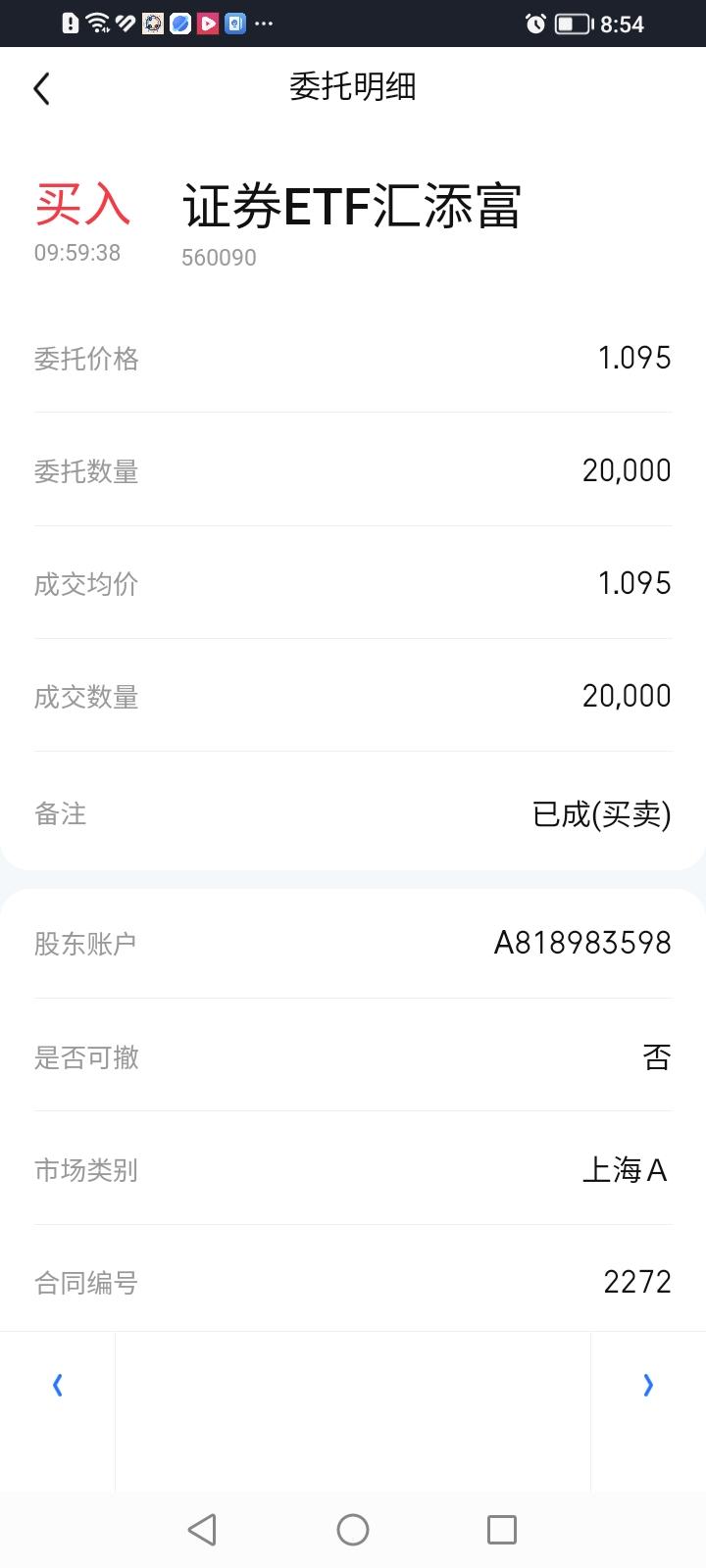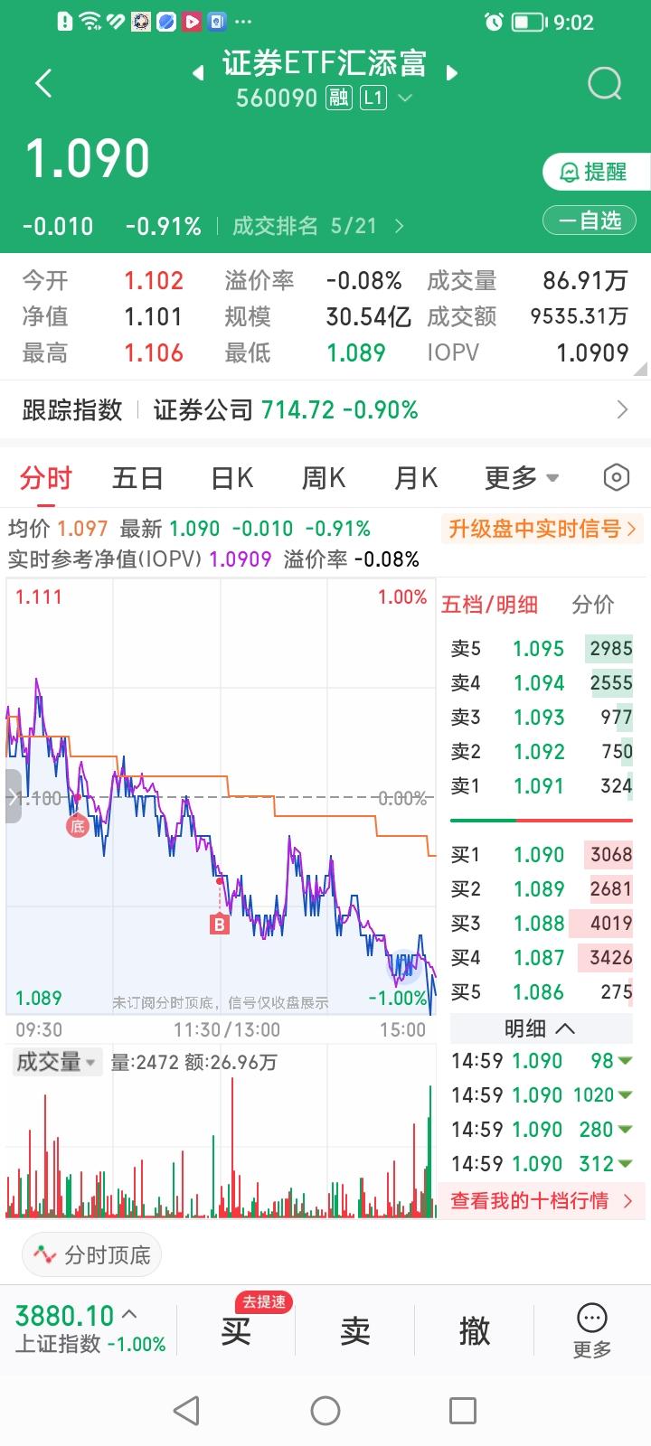 完犊子了,今天继续买入证券ETF汇添富,没想到又被套了。 今天一开盘挂了个1.095元的买单买入证券ETF汇添富,等到上午10:00左右终于成交了。没想到它下午开启了一路滑落的地狱模式,最低跌到了1.089元。收盘价1.090元。 券商股到底何时见底?这是否是黎明前最黑暗的时刻?