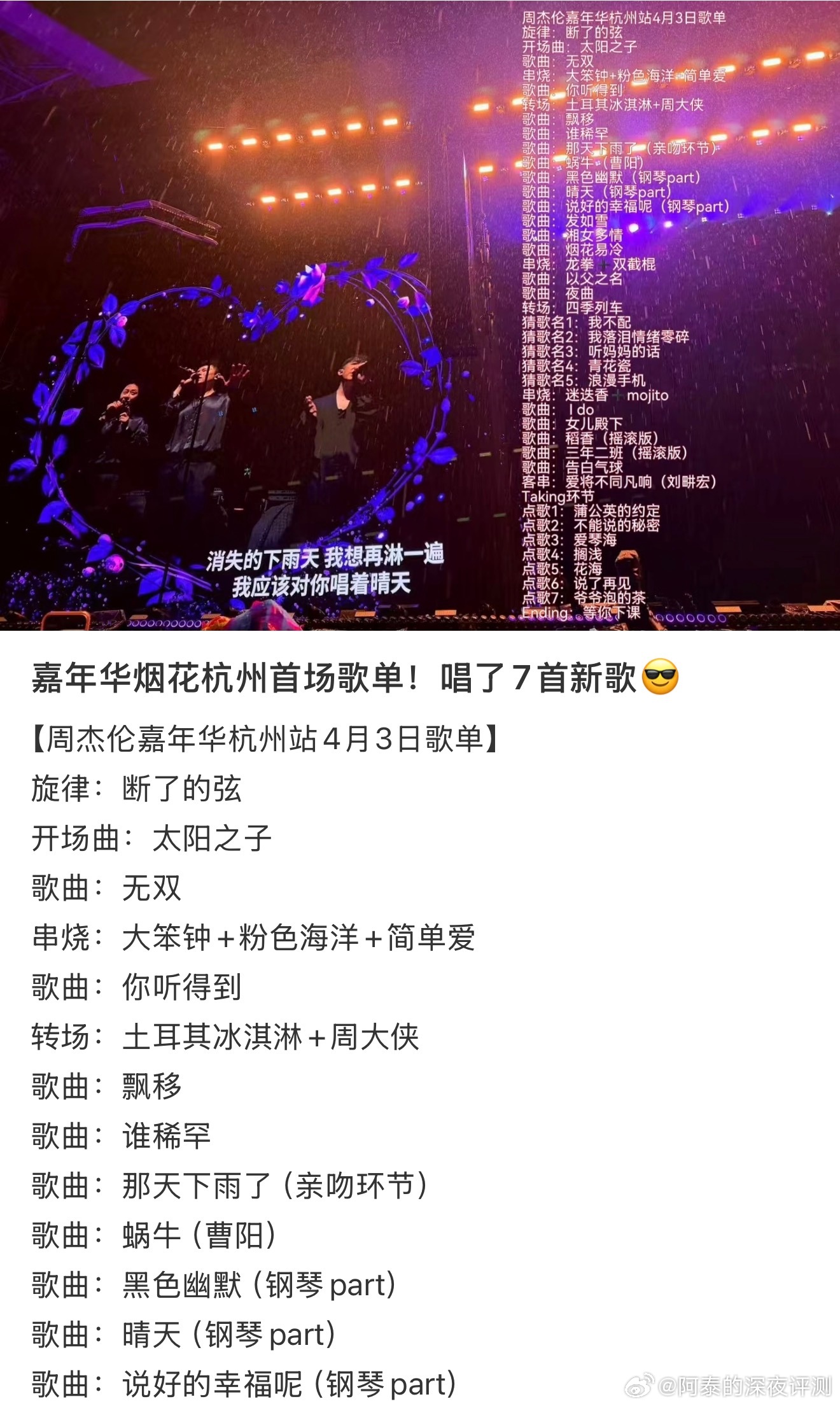 朋友圈好多去看了周杰伦杭州演唱会周杰伦演唱会还唱了新歌!!唱了《那天下雨了》,杭州还真下雨了☔️真好啊!!
