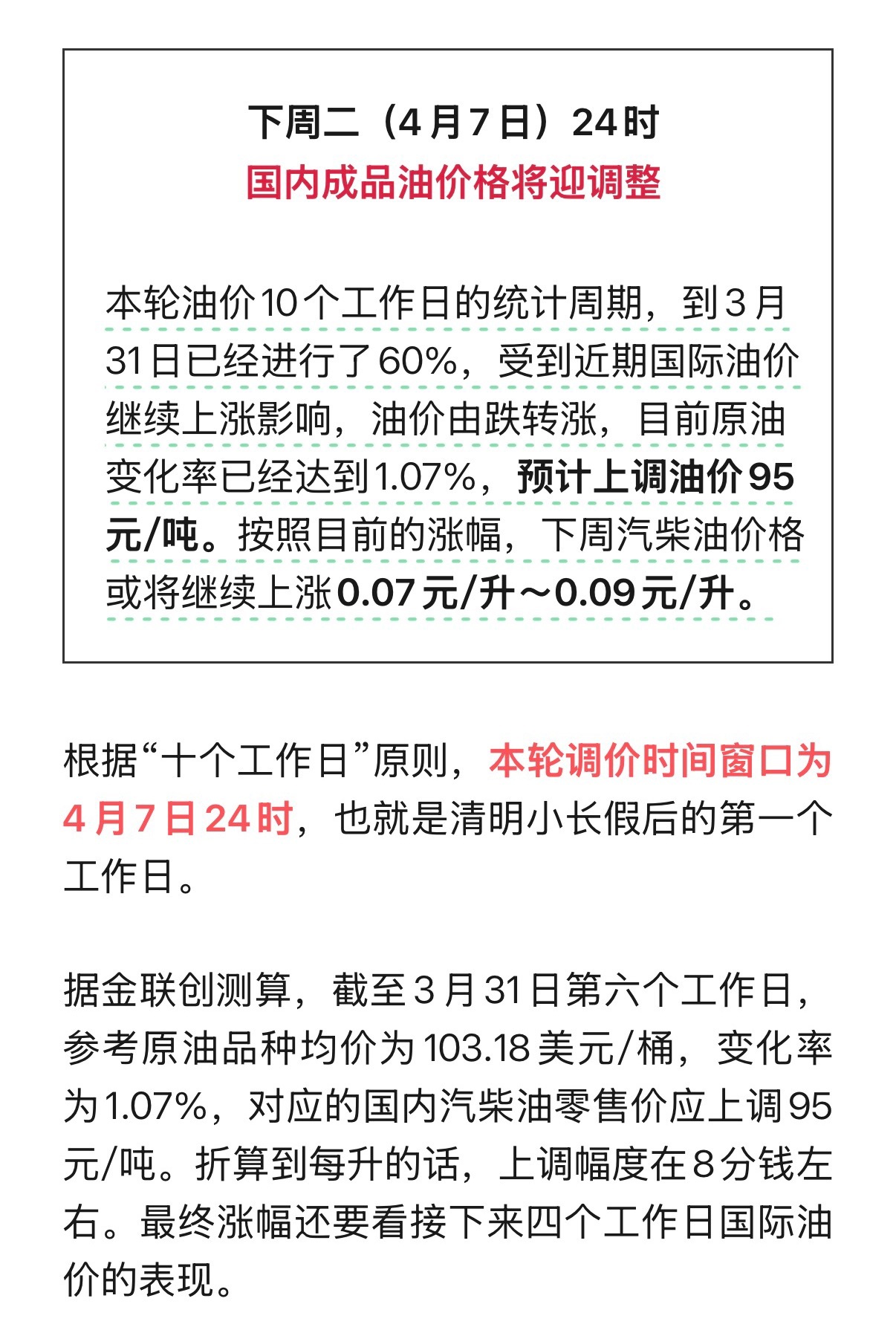 油价清明假期结束后的第一个工作日,价格上调,涨幅不大,大家不用太担心