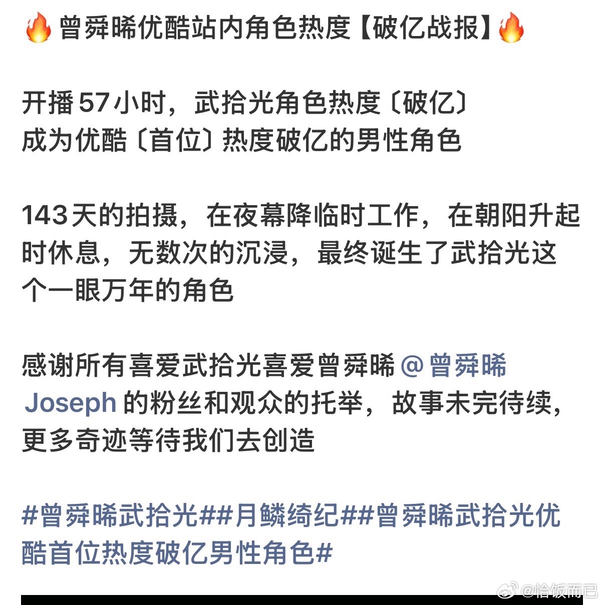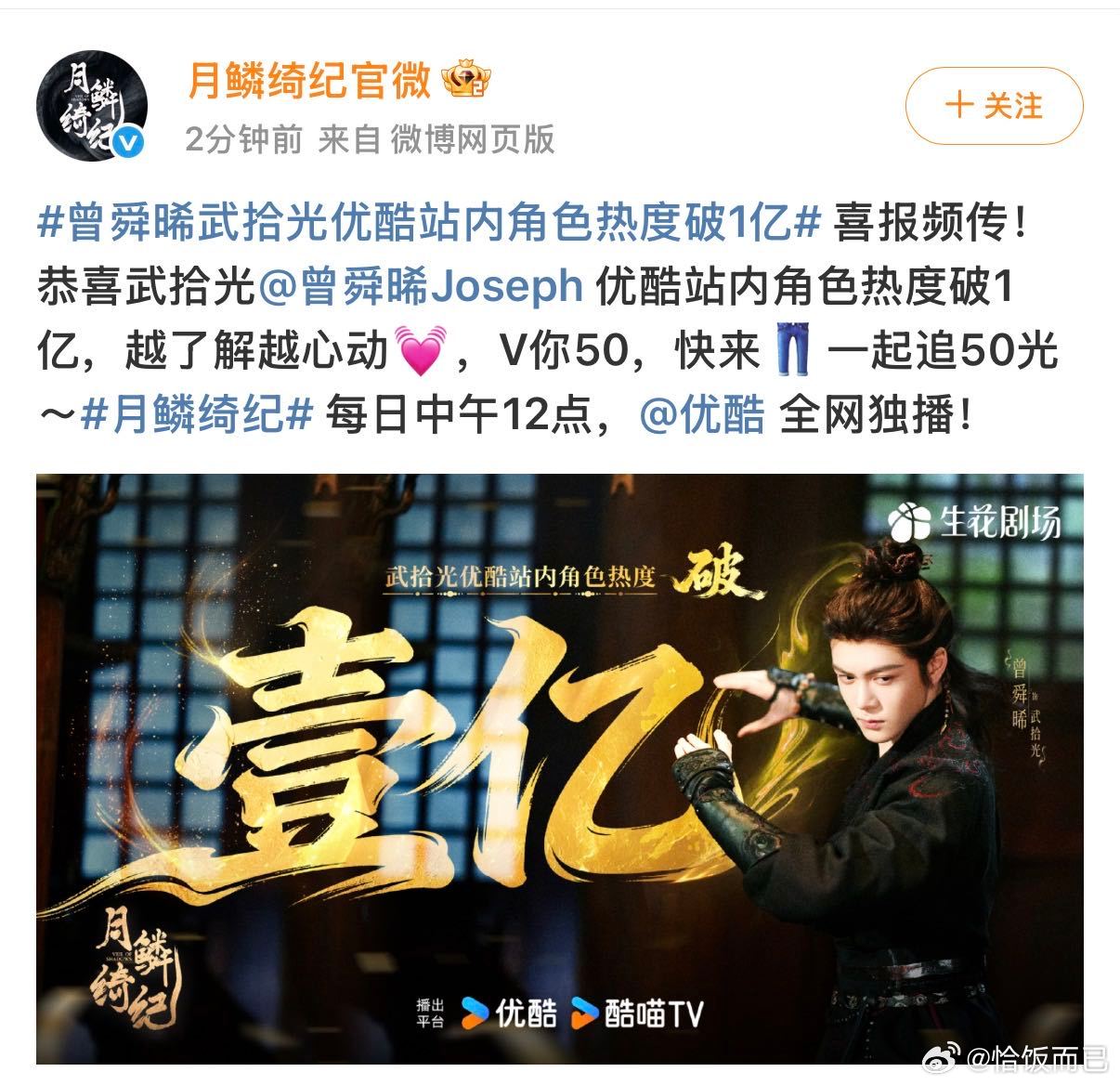 曾舜晞武拾光成为优酷平台首个角色热度破亿男主且首个男性角色,都来月鳞绮纪看武拾光