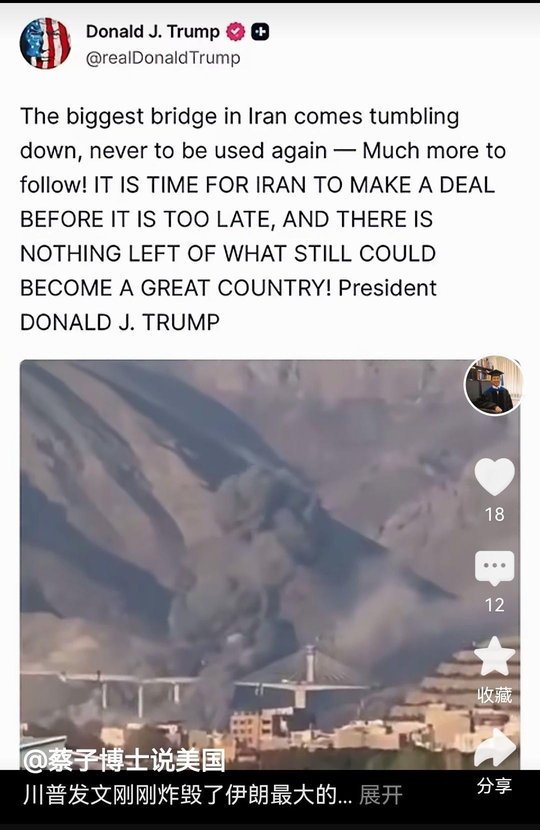 把炸毁民生设施当短视频变现,特朗普这波操作彻底杀疯了! 贝伊克大桥惨遭美以联军导弹点名,这座中东最高、耗资四亿美元的钢铁巨兽拦腰折断,钢筋水泥瞬间化作废墟飞溅,八名无辜平民惨遭波及命丧黄泉,九十五人血肉模糊倒在断壁残垣间。 特朗普举着高清战损视频全网叫卖,配文洋洋得意,扬言逼伊朗低头,自家媒体组团拍桌开骂,纽约时报怒斥拿平民当筹码,CNN痛批此举好比在火药桶上跳踢踏舞,华盛顿邮报直言纯属瞎折腾。 美国政客炸烂别人马路,转头当政绩炫耀,用平民尸骨垒砌的政治台阶终会坍塌,在深渊边缘狂欢的霸权,注定要先坠入自己挖好的坟墓。