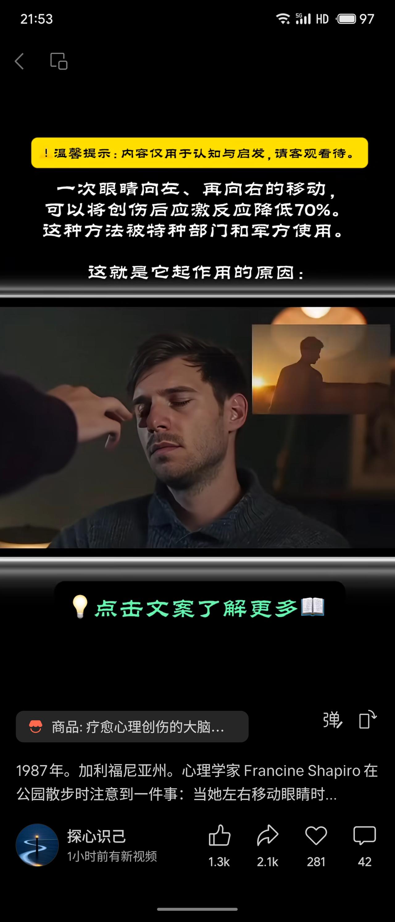 心理学家 Francine Shapiro 在1987年偶然发现:左右移动眼睛能显著降低创伤后应激反应的强度。后续研究证实,这种方法(眼动脱敏与再加工,EMDR)可使情绪困扰减少约70%,现被特种部队、军方用于心理干预。通过双侧刺激帮助大脑重新处理创伤记忆,简单却有效,是科学验证的疗愈方式。