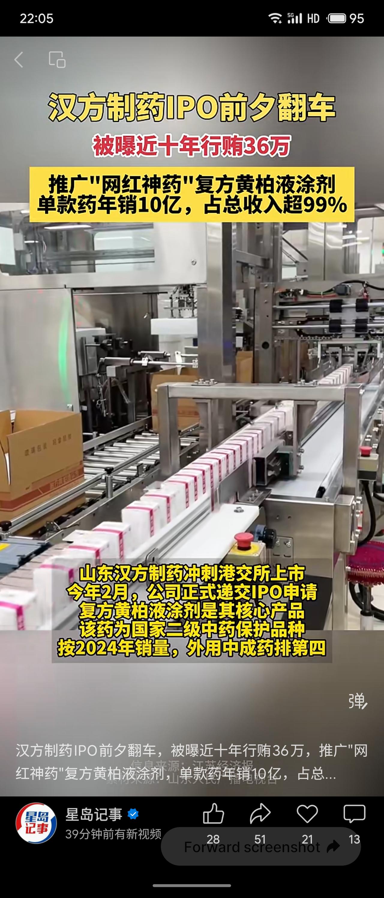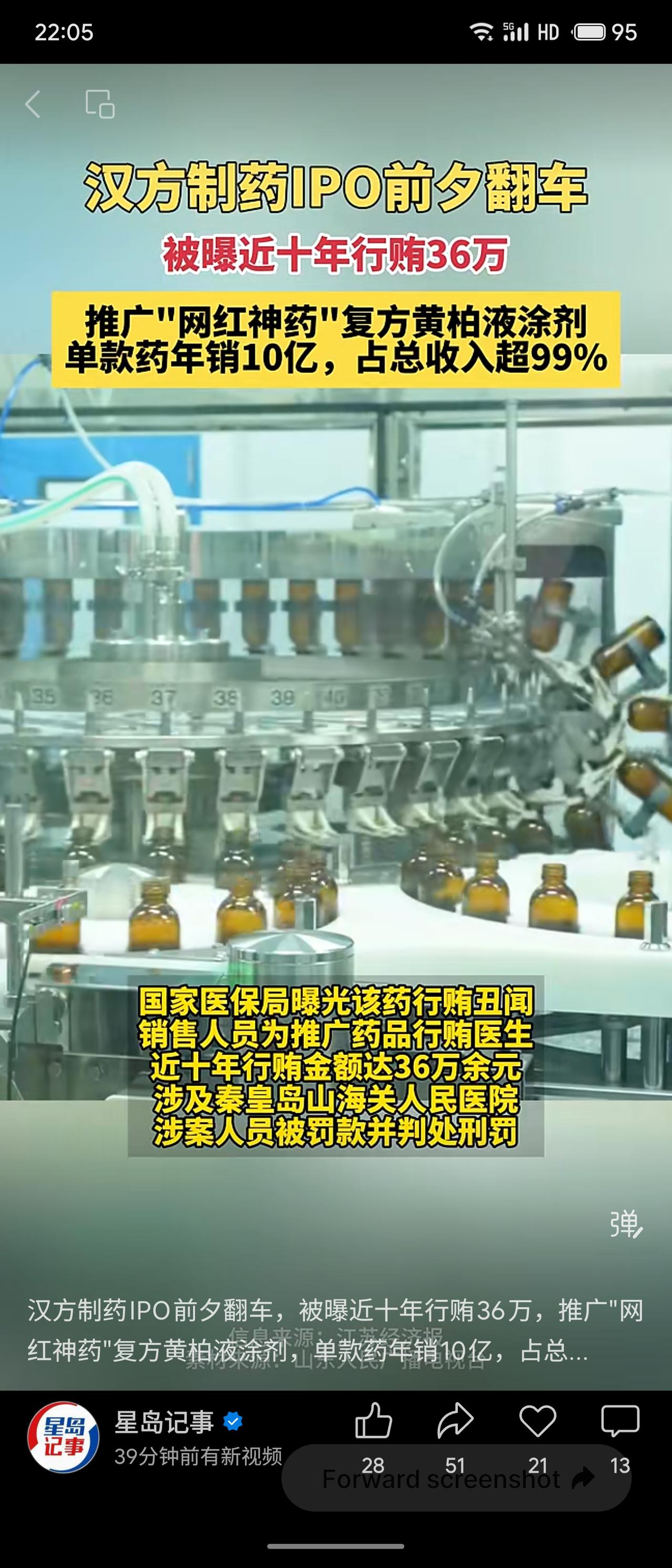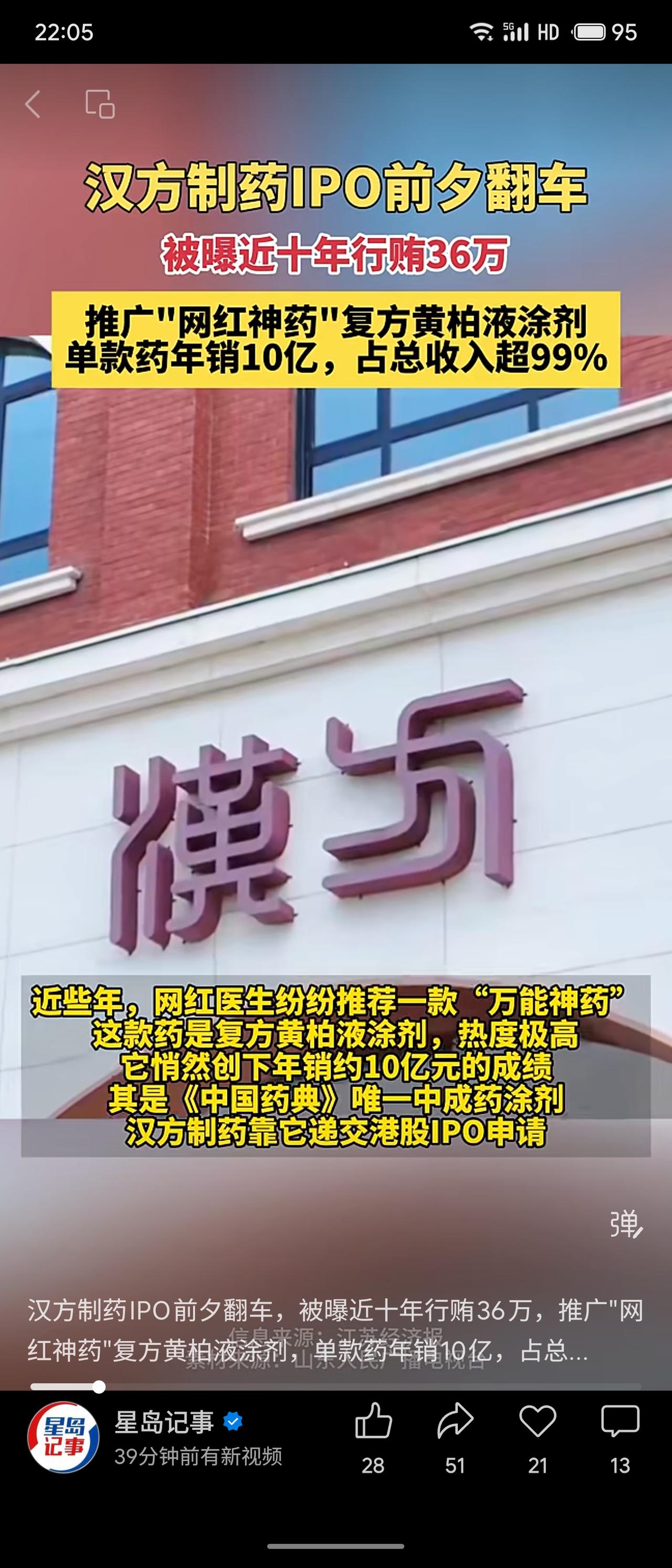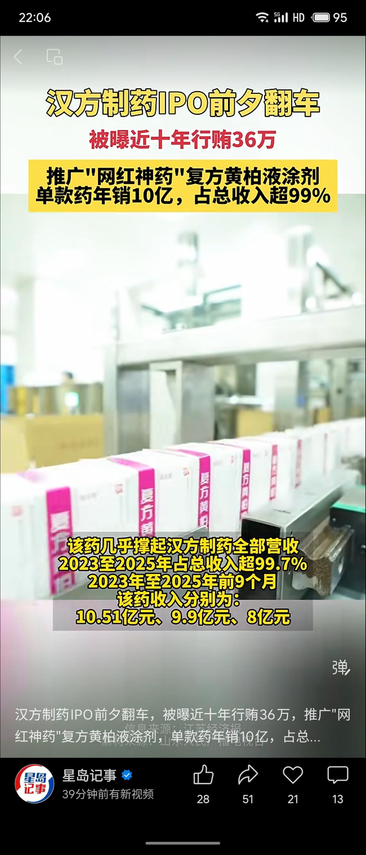 汉方制药冲刺港股IPO前夕被曝丑闻:近十年间销售人员为推广核心产品“复方黄柏液涂剂”行贿医生,累计金额36万余元,涉及秦皇岛山海关人民医院等,已被国家医保局通报并追责。该“网红神药”年销约10亿元,占公司总收入超99%(2023年达10.51亿元),产品结构极度单一。 行贿事件暴露合规内控漏洞,或影响IPO审核与市场信任。过度依赖单一品种风险极高,一旦遭遇政策调整、竞品冲击或声誉危机,公司业绩将剧烈波动。此次“翻车”给医药企业敲响警钟:资本路上合规底线不可失,产品多元化刻不容缓。
