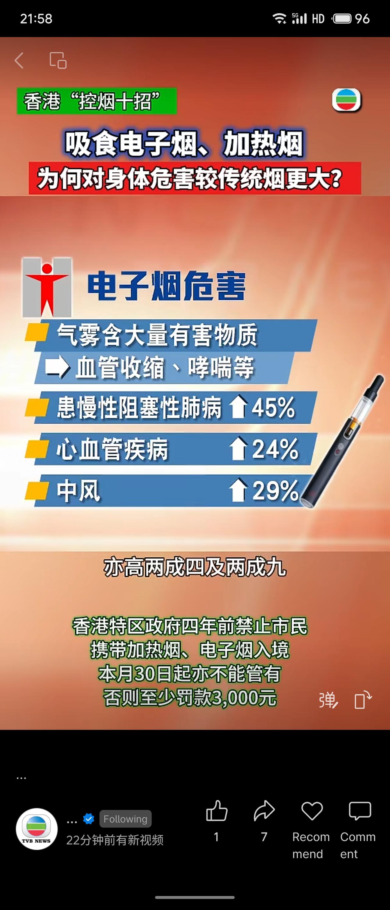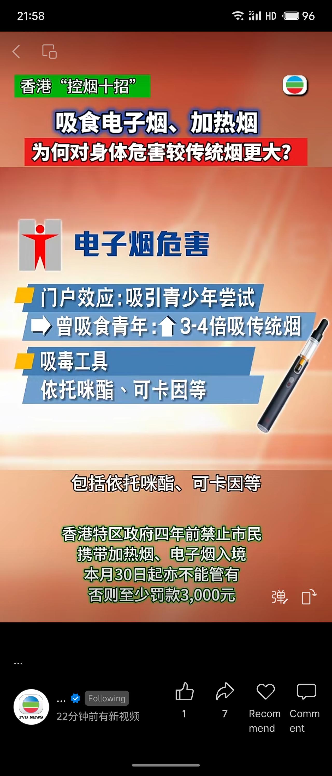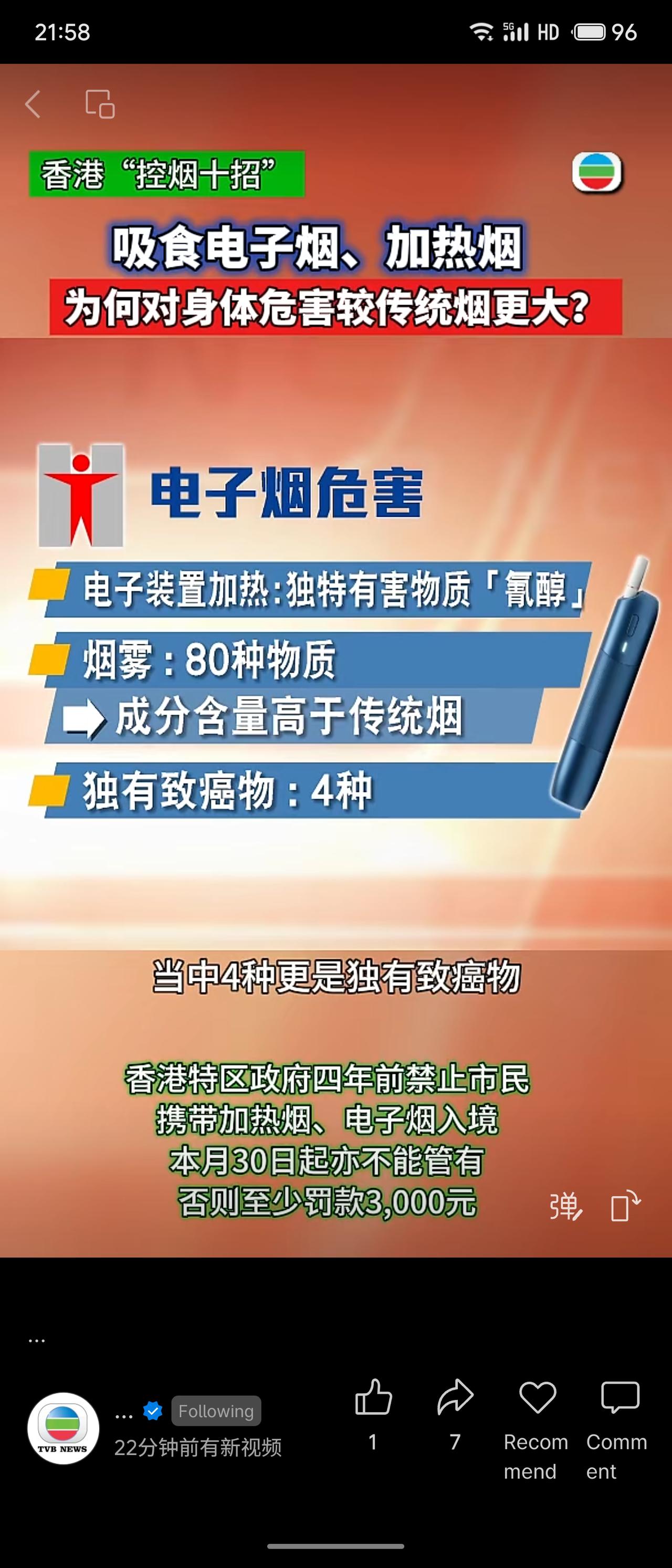 香港“控烟十招”指出,电子烟和加热烟危害甚于传统烟:加热产生独特有害物“氯醇”及4种独有致癌物,烟雾中80种物质含量更高。患病风险大增——慢阻肺+45%、心血管病+24%、中风+29%。同时产生“门户效应”,诱使青少年尝试后转吸传统烟的风险提高3-4倍,还易被掺入依托咪酯等毒品。港府已禁止携带入境,4月30日起管有即至少罚款3000元。 以更严标准管控新型烟草制品,既基于科学证据揭示其“伪减害”本质,也针对青少年与毒品交叉风险提前设防。重罚管有行为,体现从源头切断接触的治理决心。