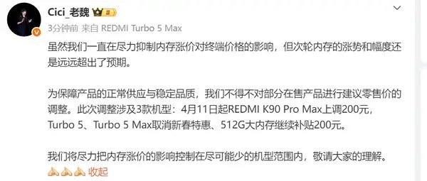 小米中国区市场部总经理“Cici老魏”通过社交平台发布声明,宣布因内存价格持续上涨,小米将对部分在售机型进行价格调整。这是继OPPO、vivo等厂商3月调价后,又一家主流手机品牌因成本压力调整终端售价。