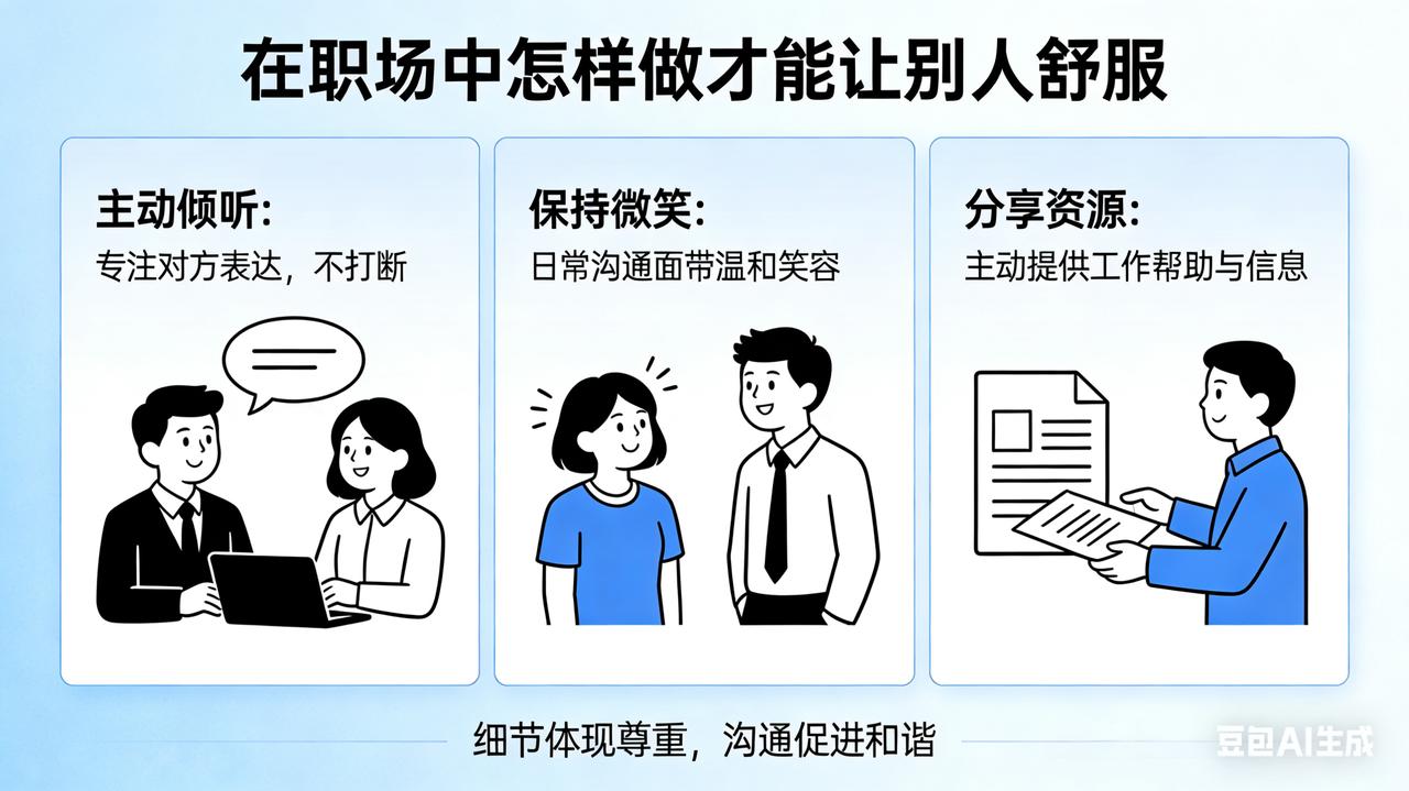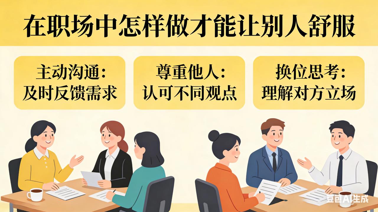 1. 沟通清晰,减少认知负担。重要信息用“结论+细节”的结构,比如“项目推迟到下周三(结论),因为客户要修改方案(细节)”。需要对方决策时,提供选项和建议,而不是单纯提问。 2. 守时守诺,降低信任成本。答应的事要在约定时间反馈,哪怕只说一句“还在进行中”。有变动提前通知,别让对方措手不及。 3. 管理情绪,不制造压力。尽量用“事实+感受+需求”的方式沟通,比如“这个任务时间比较紧(事实),我有点担心(感受),能不能协调下优先级(需求)?” 遇到问题先想解决方案,而不是找人问责。 4. 尊重边界,不越界。别人专注时不打断,可以留言或稍后再找。不问太私人的问题,不随意替别人做决定。 5. 善于合作,不争功不甩锅。跨部门沟通前先对齐目标,多说“我们一起看看”。有成绩时提到别人的贡献,出问题时先分析流程而非指责个人。 6. 提供情绪价值,适时肯定。别人帮了你,说“多亏你提醒”;同事表现好,公开说“这个方案很清晰,我也学到了”。别人吐槽时,先倾听和共情,别急着给建议。 记住一个核心:让别人舒服,不是牺牲自己,而是找到共赢的节奏。如果你因此过度内耗,说明环境或方式需要调整。真正的职场舒适感,是彼此尊重、合作顺畅——而不是一方单方面迁就。