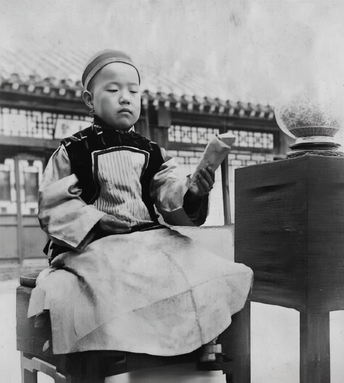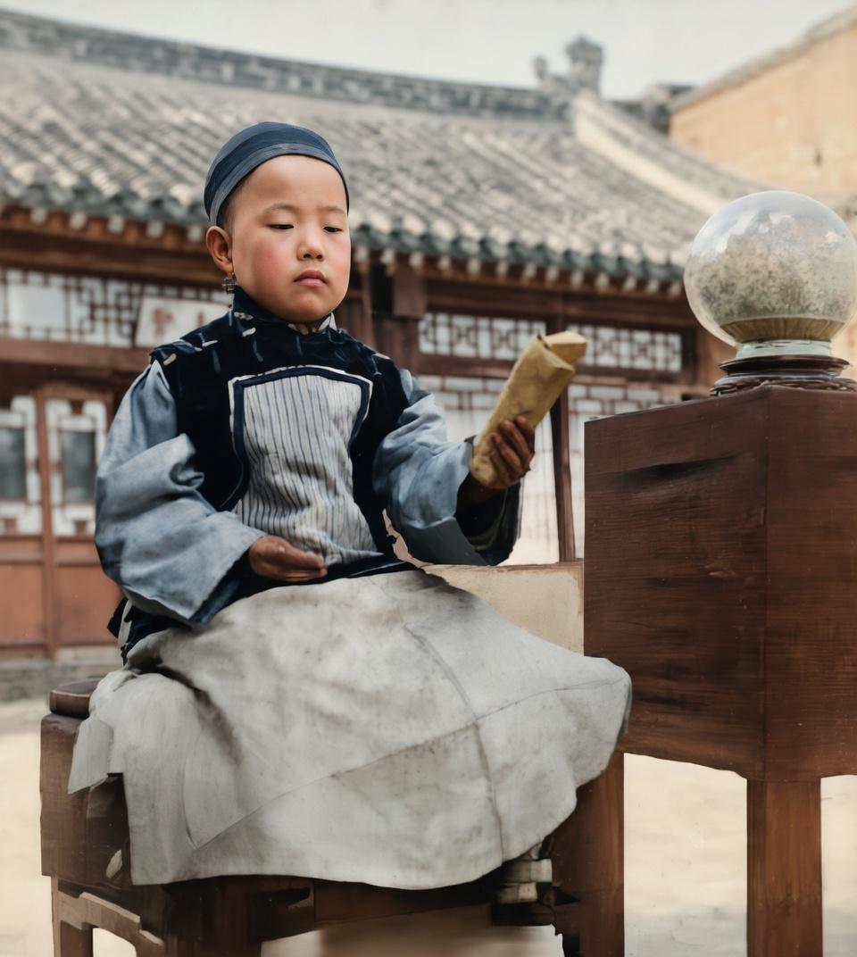 清末,大户人家幼童的照相馆摆拍肖像,照片中的孩子,是年仅3-5岁的清末官宦家庭的男童,内搭竖条纹大襟袄,外罩黑缎镶边坎肩,头戴精致的小便帽,面料考究、做工精细,普通百姓家的孩子只能穿粗布短打,绝无可能拥有这样的服饰。 孩子低垂双眼、手持线装书卷,摆出捧书阅读的姿态,这是摄影师刻意指导的摆拍造型——清末摄影刚传入中国,民间普遍迷信“照相摄魂”,幼童面对镜头极度紧张,不可能自然专注地看书,所有“认真读书”的神态都是表演出来的。 古代社会学而优则仕是唯一的阶层上升通道,对于富贵家庭来说,让孩子读书、走科举之路,是维持家族地位、进入权力阶层的核心手段,因此读书不仅是学习,更是身份和地位的象征,是家族声望的核心载体。
