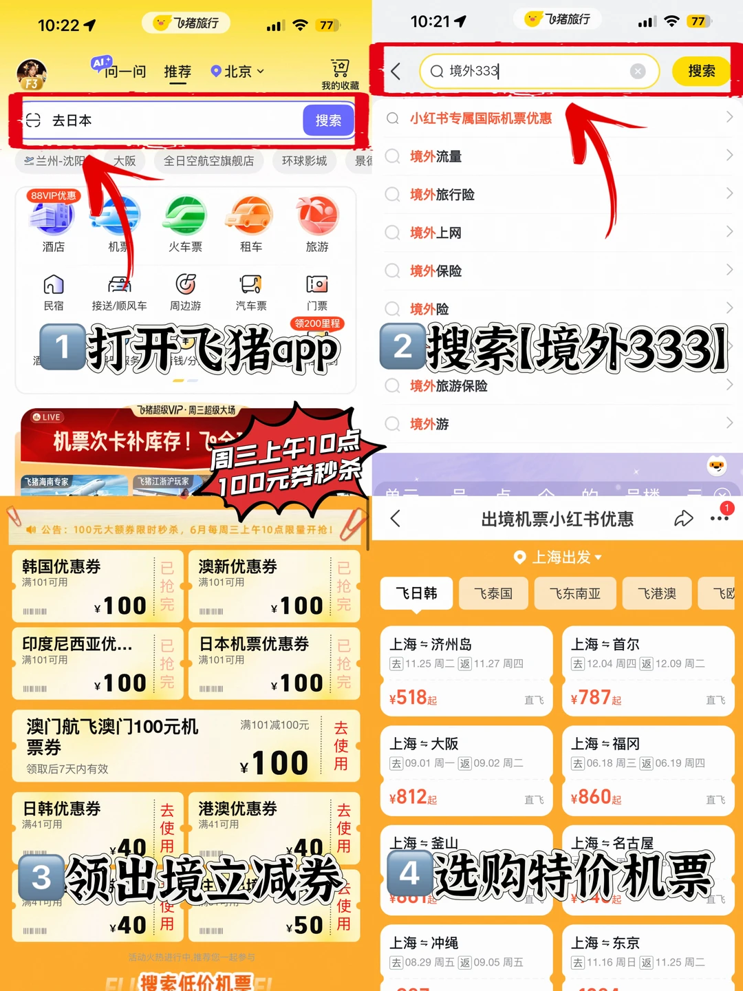 2️⃣机票:用飞猪搜【境外333】领取大额机票立减券,这个是随时领随时就能用。选早班机抵大阪、晚班机返程,最大化游玩时间!