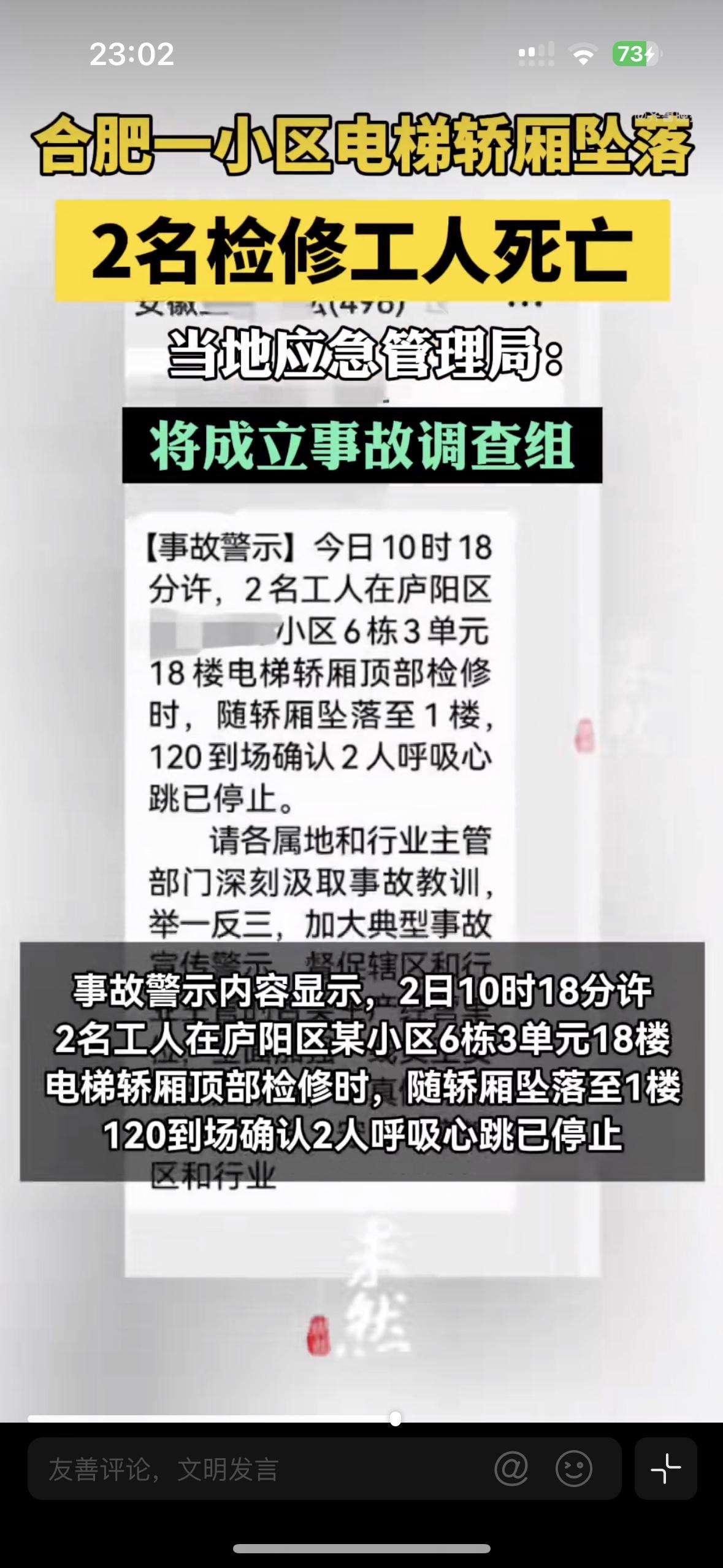 想想都害怕!谁能想到,修个电梯能遇到这种事 4月2号上午,2个工人正在18楼修检电梯,本来是正常的,结果电梯突然从18楼掉到底层。 120赶到的时候人已经没了,太可怕了,还是专业人员,都出这么大的事故,以后还是别增加高层建筑了,以前的步梯房就很好,至少不会出现突然没命的这种事情