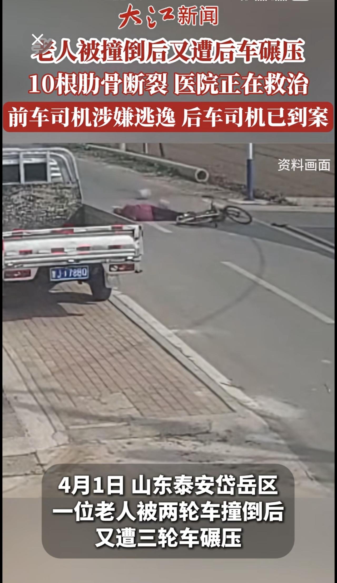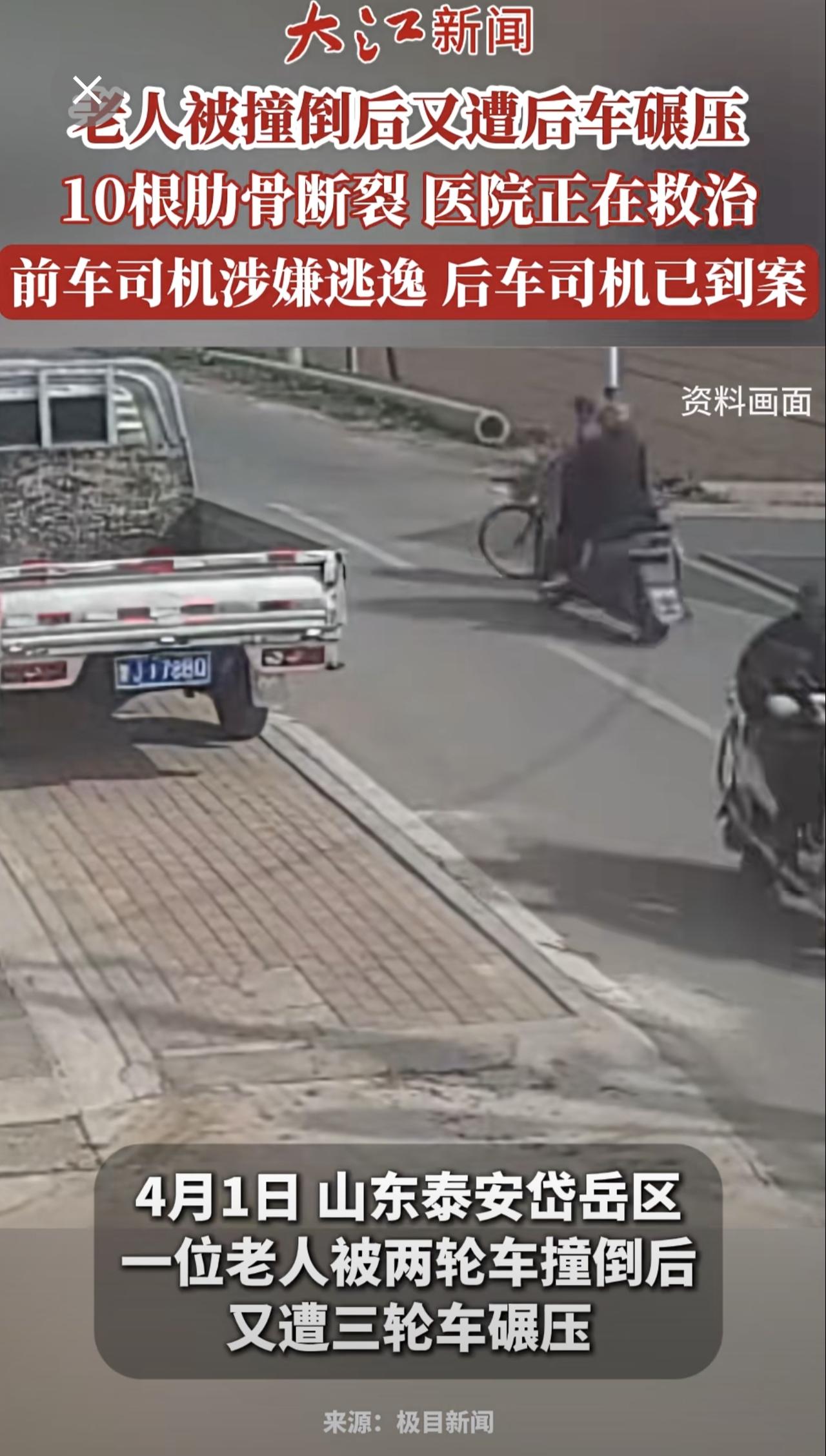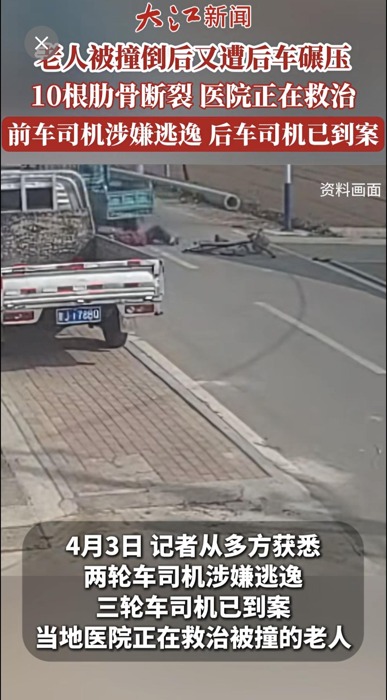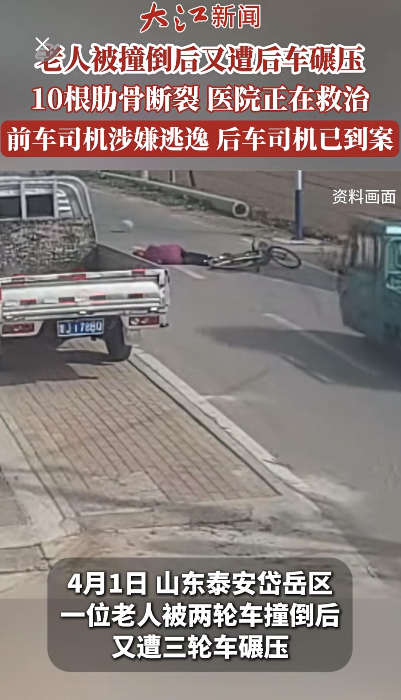 老人被撞倒后又遭后车碾压10根肋骨断裂仍在ICU抢救前车司机涉嫌逃逸后车司