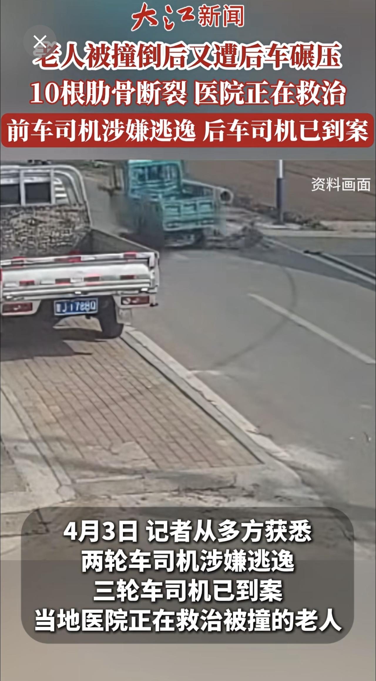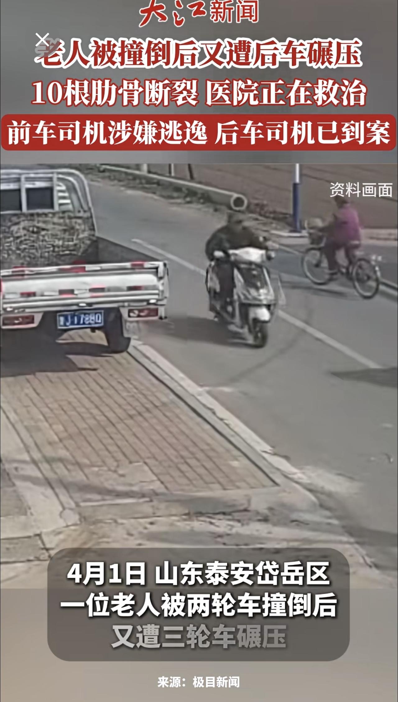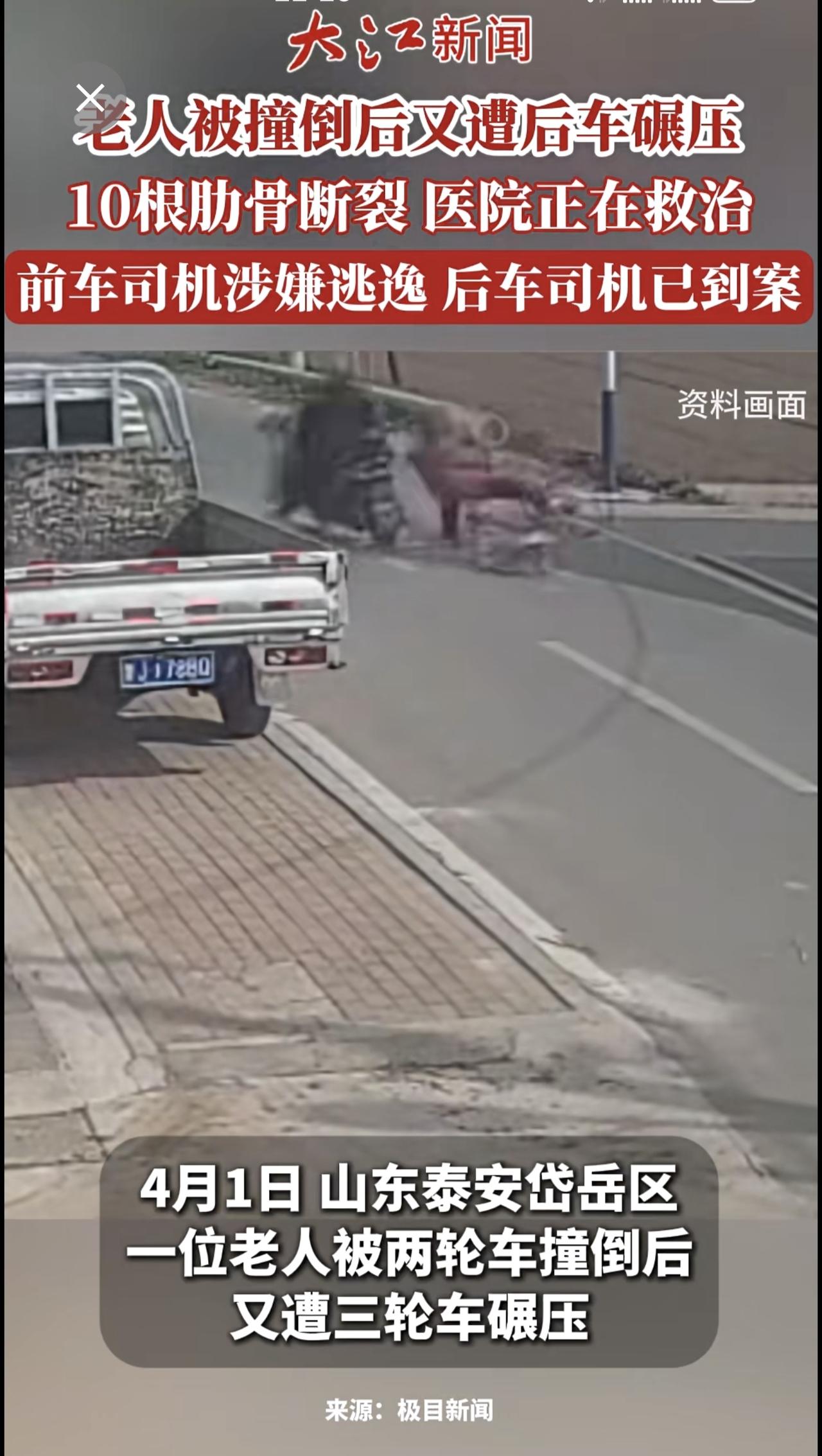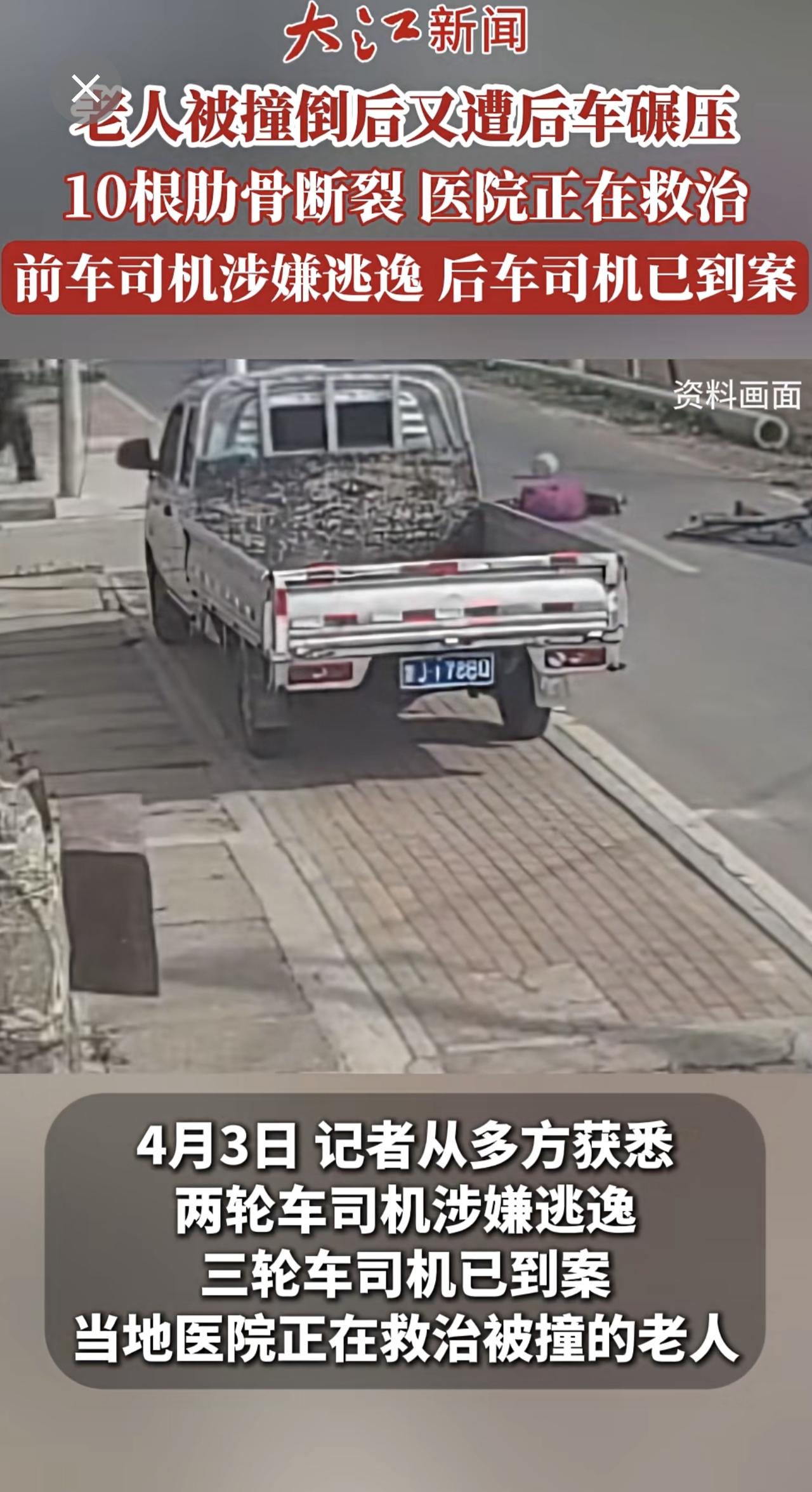 老人被撞倒后又遭后车碾压10根肋骨断裂仍在ICU抢救前车司机涉嫌逃逸后车司