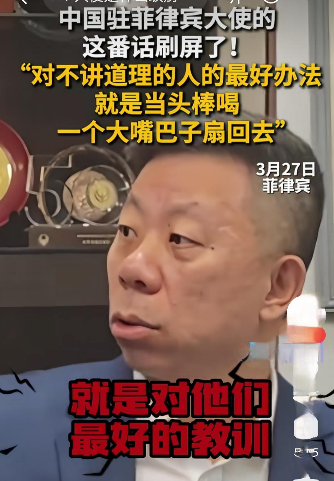 驻菲大使这段话刷屏了:“对这帮人,最好的办法,就是当头棒喝,一个大嘴巴子扇回去,对他是最好的一个教训,我们忍耐是对那些懂道理的人,我们要相互尊重,是吧?我们保持低调。对那些不懂道理的人,你的忍耐只会让他,鼓励他,不断地挑衅你的底线,不断地采取损害你利益的行动。” 说的好!善良有门槛,包容分对象,敢果断亮剑,敢硬气反击,用最直接的态度划定边界,直接斩断对方的贪念和嚣张!纵容恶人,就是伤害自己,包容会成为对方得寸进尺的底气 ,隐忍会助乇对方肆无忌惮的嚣张! 所以该出手就出手,能动手就别吵吵!