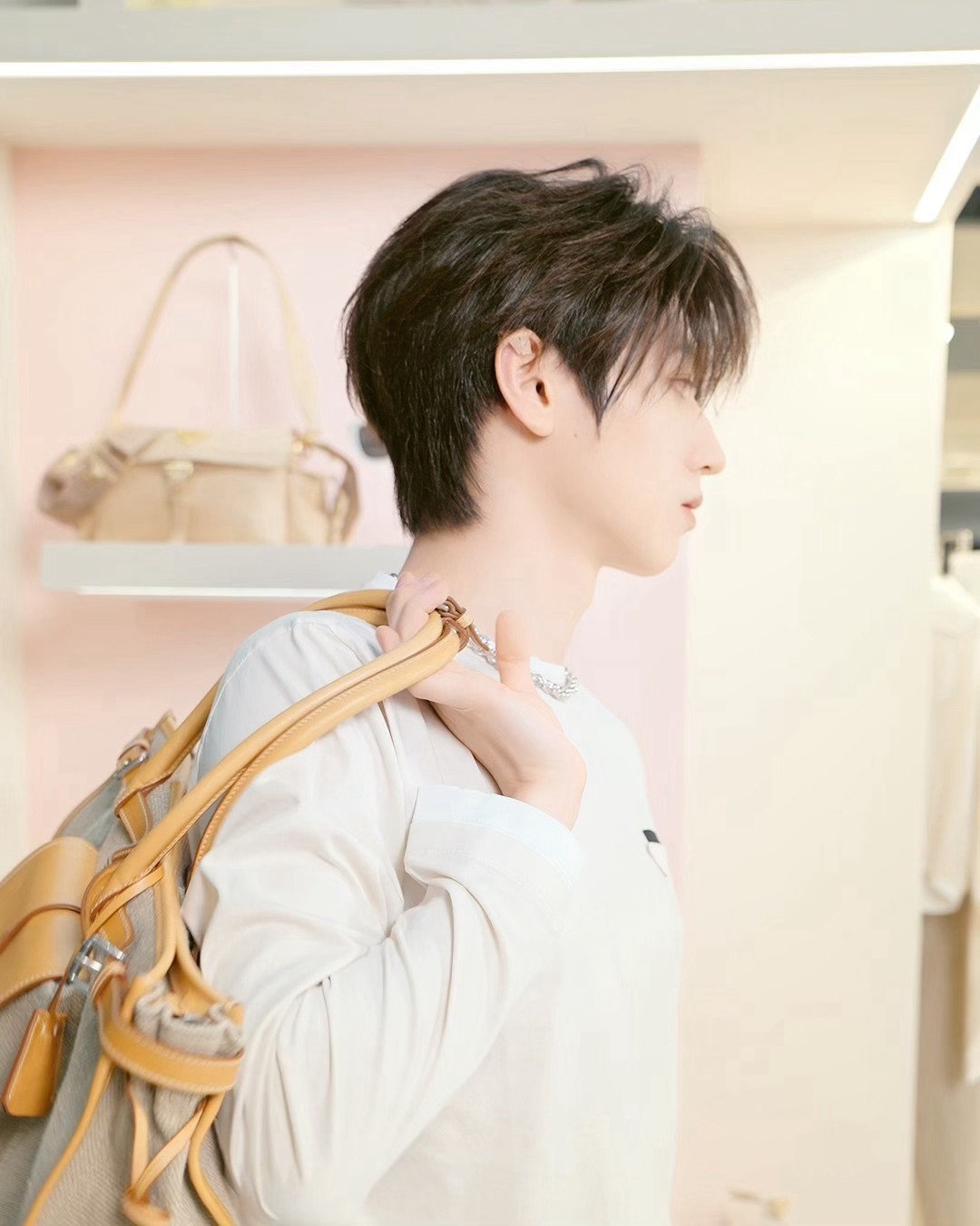 官方大片发布,身穿棉质长袖 T 恤搭配丹宁牛仔裤,点缀精品珠宝 Eternal Gold 系列黄金项链,手提Bonnie 皮革包,简约闲适,赴约初夏好心情🤍