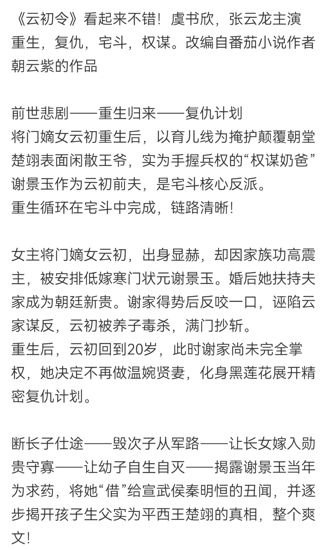 云初令虞书欣云初令海报《云初令》圆满杀青!这才是属于中式大女主的复仇史诗,堪称古风版《黑暗荣耀》将门嫡女云初重生归来,朝堂权谋步步惊心,爱恨纠葛刻骨铭心。本作改编自番茄小说朝云紫同名原著,作者笔力扎实口碑爆棚等剧太煎熬,速来读原著,一起胚胎式追剧,提前解锁完整复仇线!云初令全阵容发布云初令全员飞花令版海报云初令杀青图云初令原著