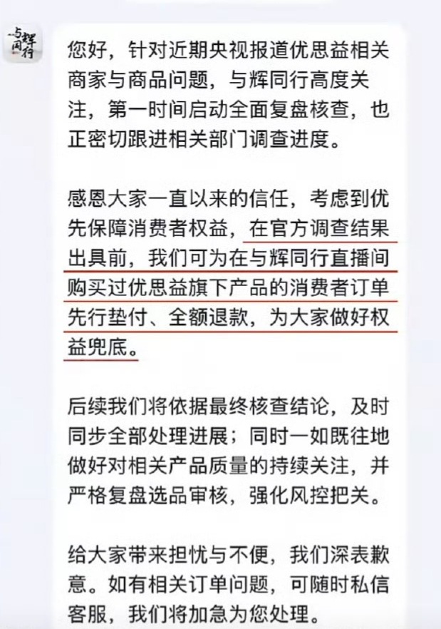 与辉同行宣布全额退款 做错了就要立正挨打,并且赔偿顾客的全部损失,这是最基本的要求,董宇辉这次做的还算不错。希望他们以后的选品能够再严格一些,下不为例了。