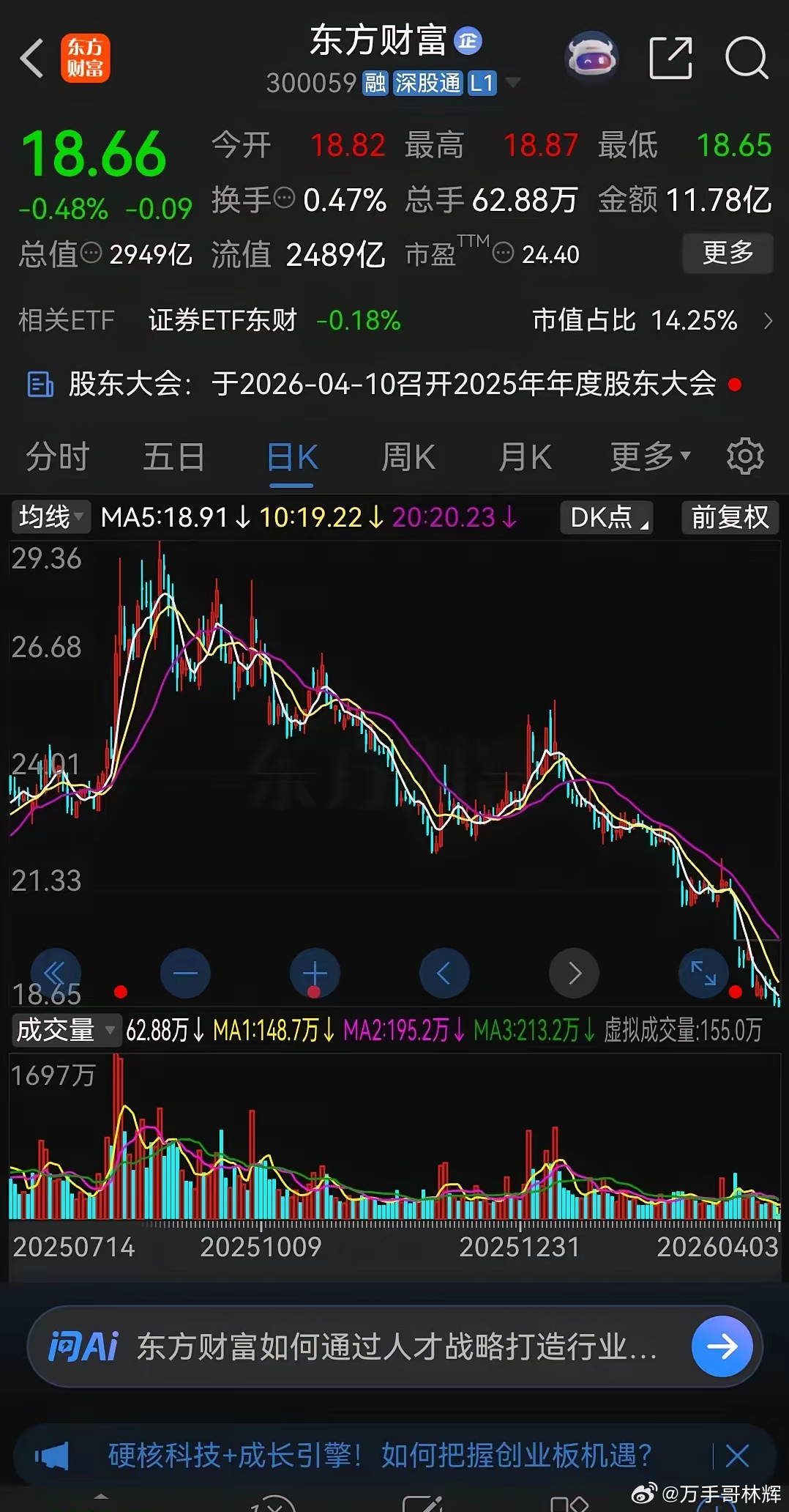 东方财富从去年8月份就开始一路狂跌,下跌的过程中偶尔来个反弹,吸引散户抄底,然后再次一路下跌,把抄底的股民一波接着一波地“埋”了。今天股价再创新低18.65元,7个月时间,东方财富的股价从最高29.36元跌到了现在的18.66元,已经下跌了36%。
