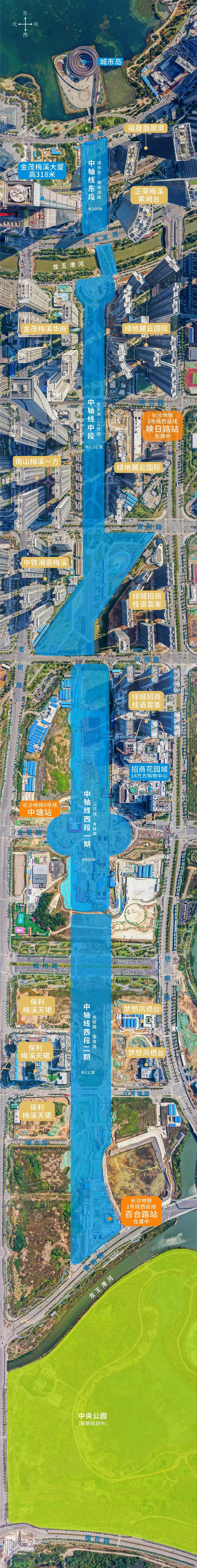 全线贯通再迎新进展!长沙梅溪湖中轴收官段正式启动建设 近日,长沙梅溪湖超级中轴建设迎来关键里程碑,作为中轴线全线贯通的收官核心节点,西段二期(中塘站-中央公园)主体工程正式启动建设,标志着这条贯穿梅溪湖片区的城市发展主轴,即将完成全线版图的最后一块拼图,距离全面贯通的目标再近一步 。 梅溪湖中轴线东起城市岛、西至中央公园,全长约3.3公里、宽约80米,是梅溪湖国际新城从“环湖时代”迈向“中轴时代”的核心发展引擎,也是以TOD开发模式为核心,集交通枢纽、生态景观、商业商务、公共休闲于一体的综合性城市配套工程 。截至目前,中轴线东段、中段(城市岛-三环线)已全面建成并正式对市民开放,空中廊桥与城市岛实现无缝衔接,构建起连贯的慢行休闲系统,已成为片区居民日常游憩、感受城市风貌的重要公共空间 。而西段一期工程(三环线-中塘站)现已进入收尾冲刺阶段,按照建设计划,该段将于2026年正式对外开放 。 此次启动建设的西段二期工程,是梅溪湖中轴线全线建设的最后一段任务,也是补齐中轴线全链条功能配套的关键环节。项目总建筑面积约2.9万平方米,在配套建设上兼顾实用性与人性化,共规划设置地面停车位6个、地下机动车停车位577个,其中专门配套13个无障碍停车位,充分保障特殊群体的出行需求;同步规划177个新能源充电桩车位,精准适配城市绿色交通发展趋势,可全面满足周边居民及产业人群的停车与补能需求 。同时,项目将同步推进地面绿化景观、地面廊桥、地下停车场及联络通道等全配套工程建设,实现景观风貌、功能布局与中轴线全线的无缝衔接。 根据建设规划,梅溪湖中轴西段二期工程预计2027年底全面建成投用。项目建成后,将彻底完成梅溪湖中轴线的全线贯通,全面补齐片区功能配套短板,进一步完善梅溪湖片区的城市公共服务体系、提升人居品质与片区发展能级 。作为湘江新区城市建设的核心标杆项目,全线贯通后的梅溪湖超级中轴,将持续串联起片区科创总部、商务商业、生态休闲等核心功能板块,助力梅溪湖片区打造产城融合示范标杆,为长沙河西片区城市高质量发展注入持续动力。