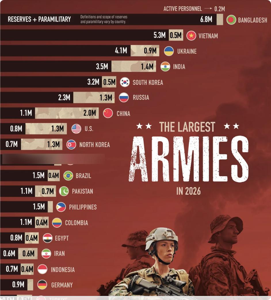 外媒:2026年全球军队规模排名显示,孟加拉国以700万总兵力意外位居榜首,但其现役军人仅20.4万,主要依靠680万预备役和准军事部队;越南以575万兵力紧随其后,同样依赖530万后备力量。乌克兰因持续冲突动员,总兵力达500万排名第三。印度现役140万、后备350万,总计490万位列第四。 若仅看现役部队,中国以200万居首,印度、俄罗斯、美国均超百万。以色列则拥有高效动员体系,总兵力67万。