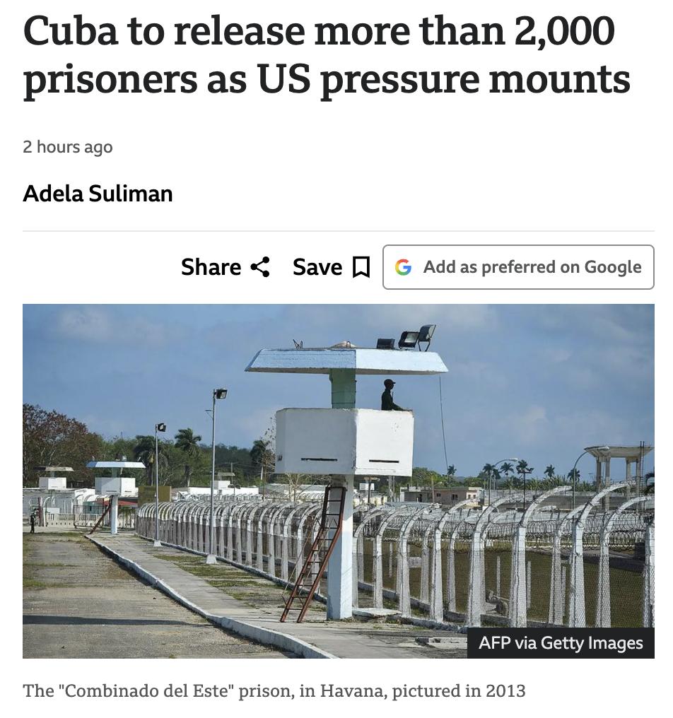 外媒:古巴宣布将释放2010名囚犯,称这是"人道主义和主权姿态",释放对象包括外国公民、年轻人、女性及60岁以上老人,正值圣周宗教庆典期间。这是古巴今年第二次大规模释囚,3月曾释放51人。 此举背景是美国持续施压:特朗普政府上台后明确意图改变古巴政权,封锁石油运输导致古巴严重燃料短缺和大规模停电,尽管上周一艘俄罗斯油轮首次靠港获特朗普默许。