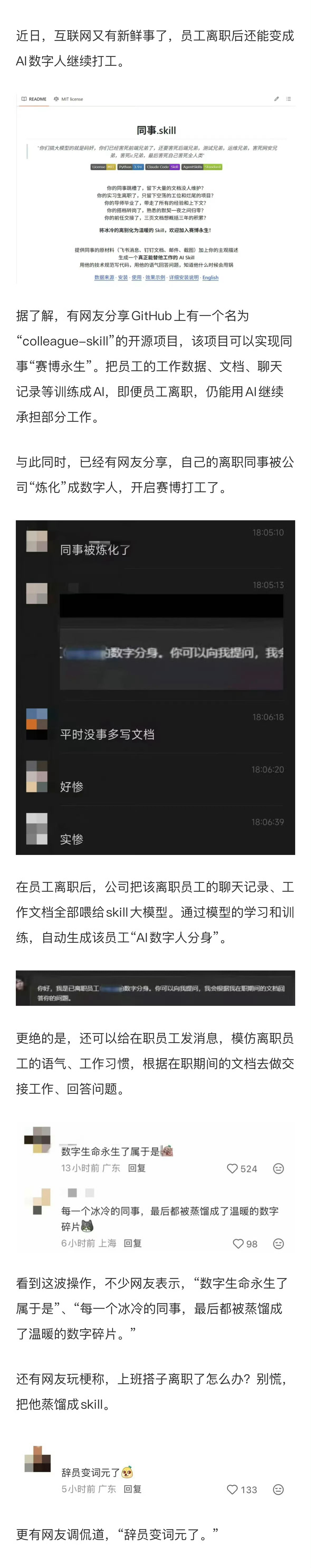 未来员工离职后,或许根本无法真正“脱身”,反而会被企业炼制成AI数字人,留在系统里永久赛博打工,成为没有休息、没有情绪、永不反抗的免费劳动力。这并非天马行空的科幻想象,而是依托现有AI技术就能落地的残酷可能。满谈职场满谈科技