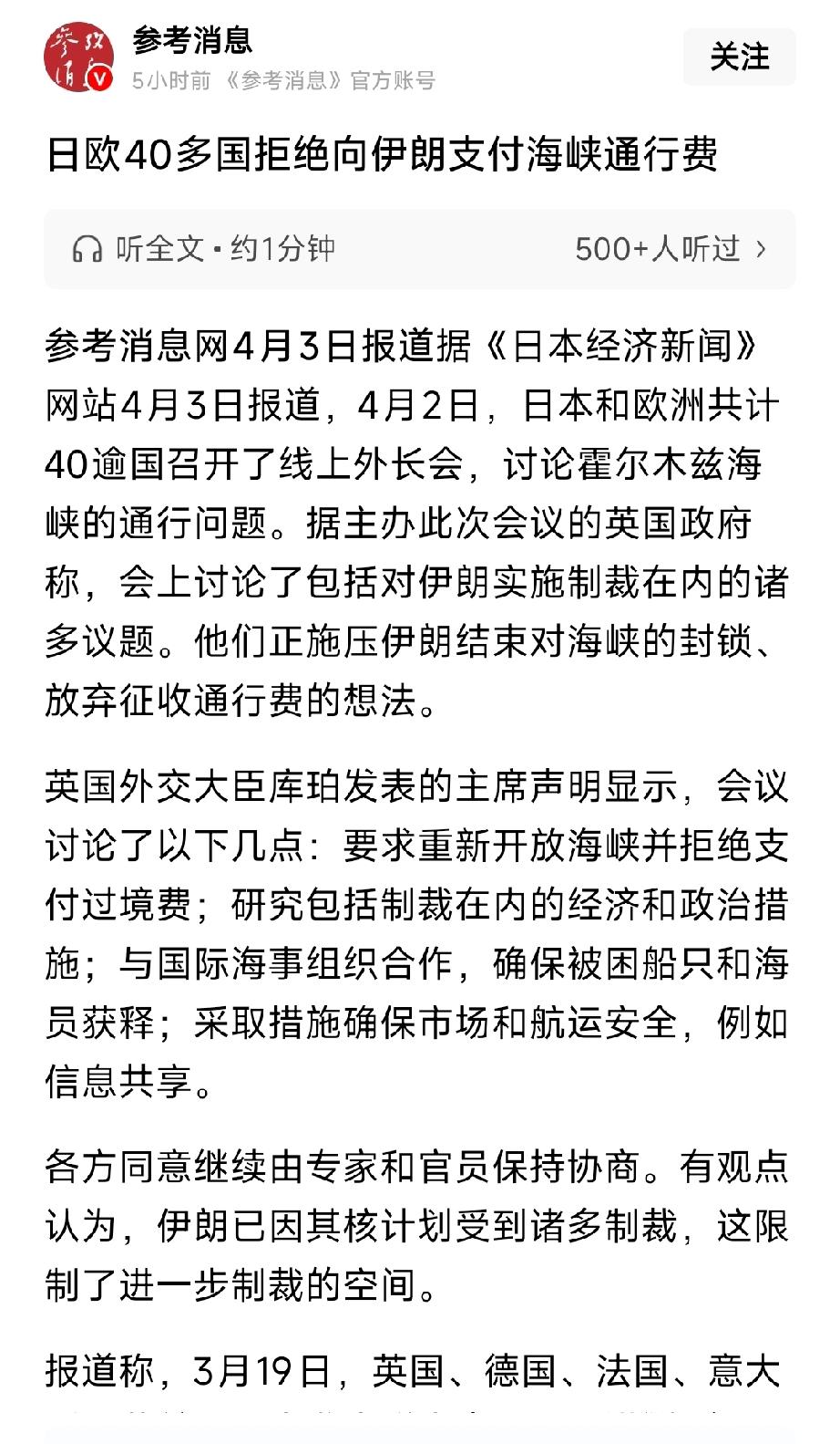 40国集体拒缴"海峡过路费"!伊朗摊牌,油价150美元倒计时 4月2日,日欧40余国召开紧急外长会,明确拒绝向伊朗支付霍尔木兹海峡通行费,并威胁加码制裁 。这标志着全球能源咽喉的博弈彻底白热化,油价冲150美元的扳机,已被西方亲手扣响 。 伊朗3月30日已通过法案,强行对海峡船只收费、禁止美以及制裁国船只通行,并要求用里亚尔结算,直接挑战石油美元体系 。如今西方集体硬刚,没有任何妥协空间 。 霍尔木兹已近乎瘫痪,全球20%石油运输断供。一旦伊朗全面锁死海峡+红海曼德海峡联动,每日再少500万桶,总缺口超1500万桶/日 。机构一致预警:48小时内油价直接破150美元,冲击200美元历史新高 。 油气、油运、煤化工、黄金四大主线将全线爆发,这不是预期,是即将发生的现实。