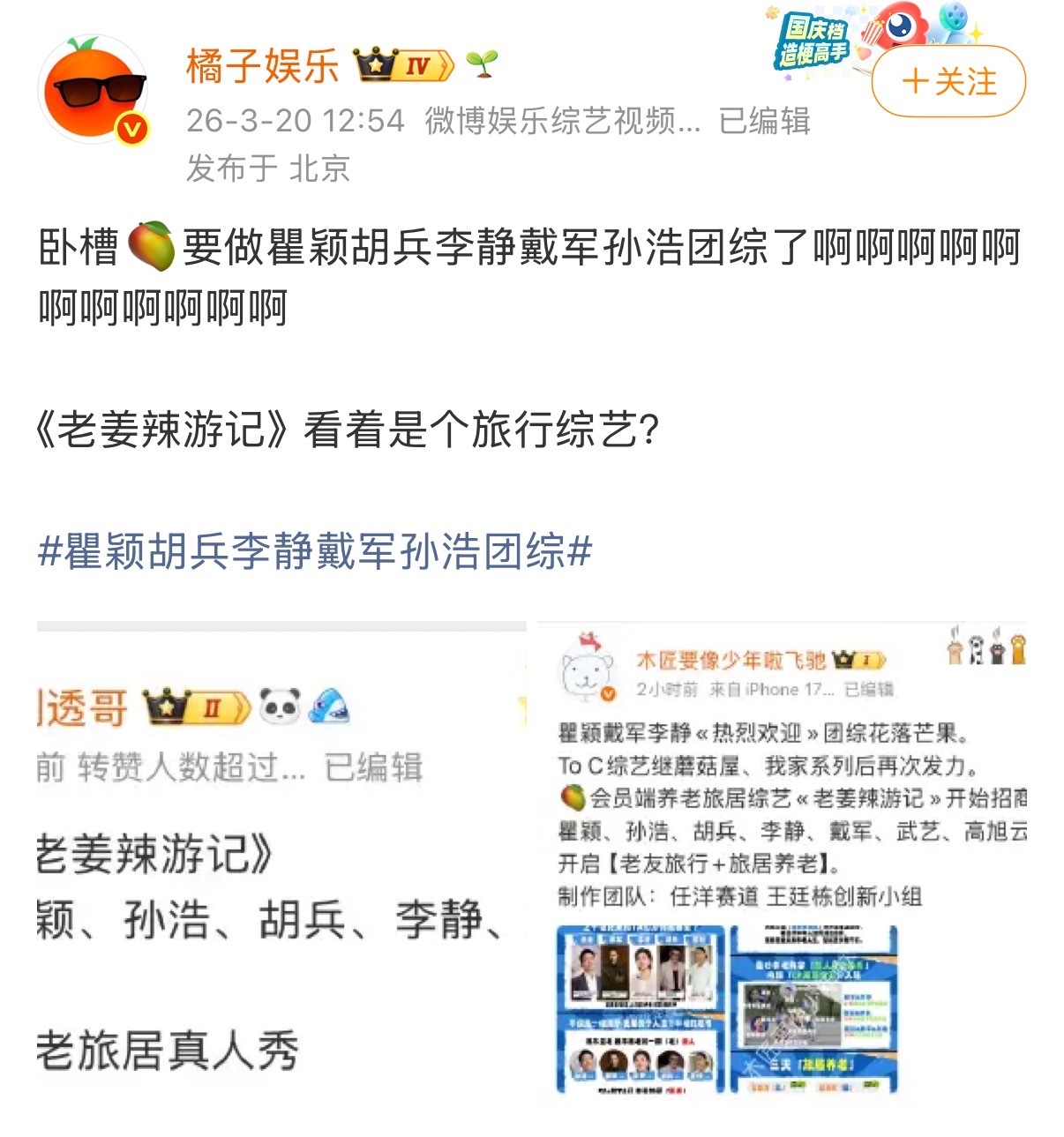 橘子夜聊 好像🥭瞿颖、胡兵、戴军的老辈子团综《老姜辣游记》真的要录了,有网友说不如叫《上世纪末的朋友》哈哈哈哈,综艺名最后还没定,不如大家来提名🫳🏻