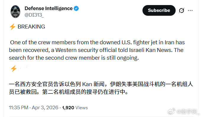 一名西方安全官员告诉以色列媒体,在伊朗被击落的美国战斗机的一名机组人员已被救回。第二名机组成员的搜寻仍在进行中。美国以色列对伊朗发动打击