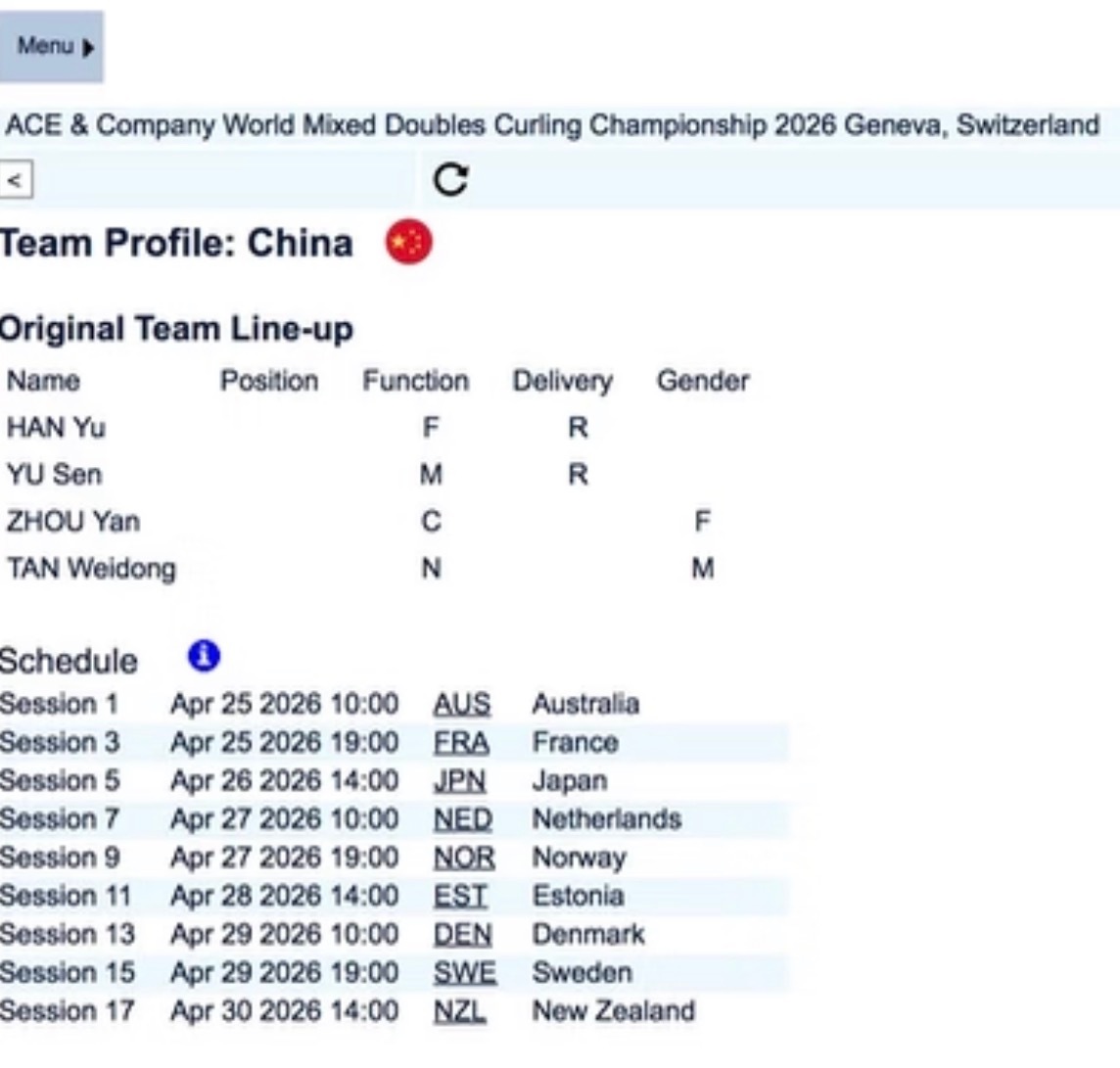 2026混双冰壶世锦赛 中国队在壶联官网的名单更新为韩雨/于森。