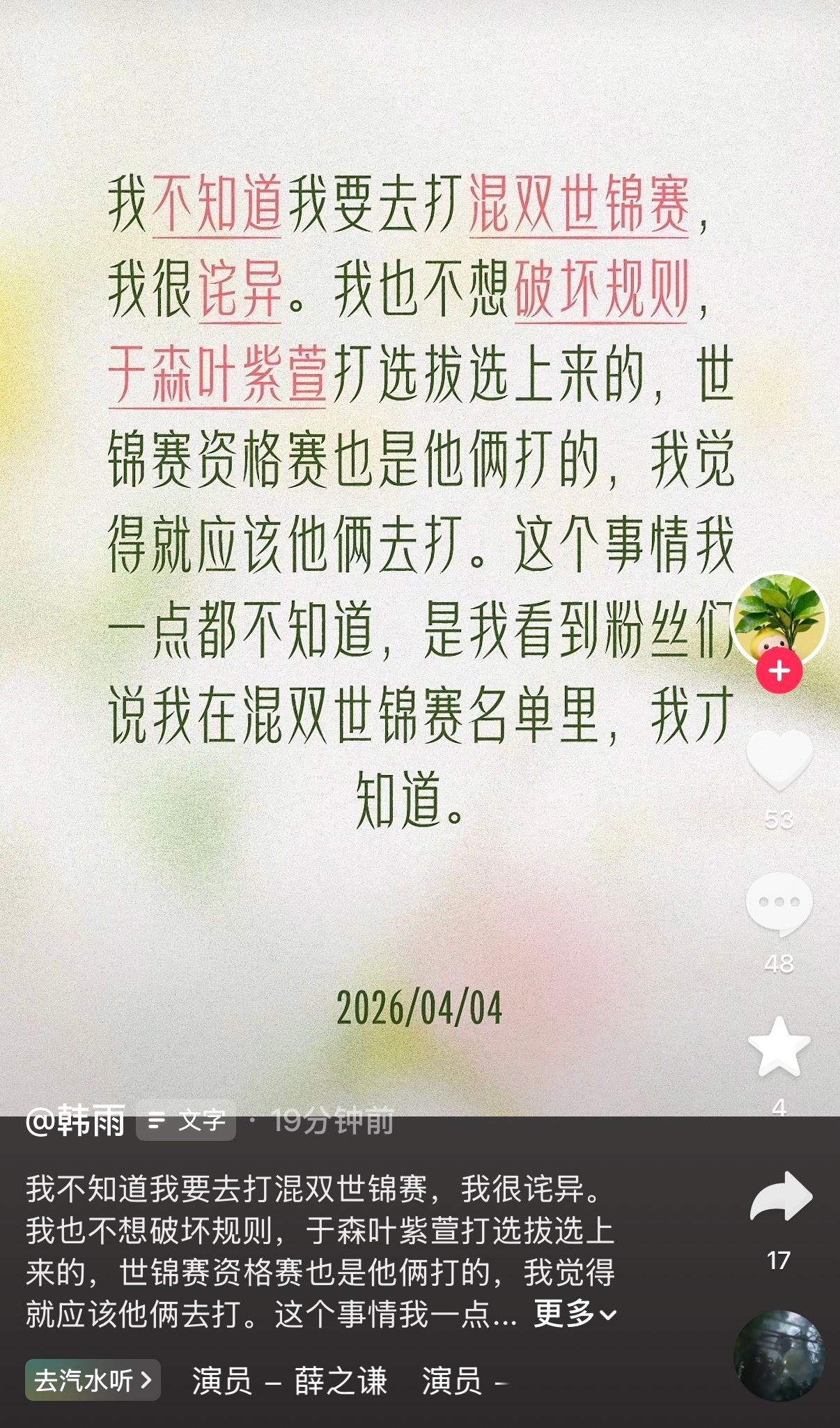 韩雨刚刚发社媒表示很诧异:“我不知道我要去打混双世锦赛,我很诧异。我也不想破坏规则,于森/叶紫萱打选拔选上来的,世锦赛资格赛也是他俩打的,我觉得就应该他俩去打。这个事情我一点都不知道,是我看到粉丝们说我在混双世锦赛名单里,我才知道。”