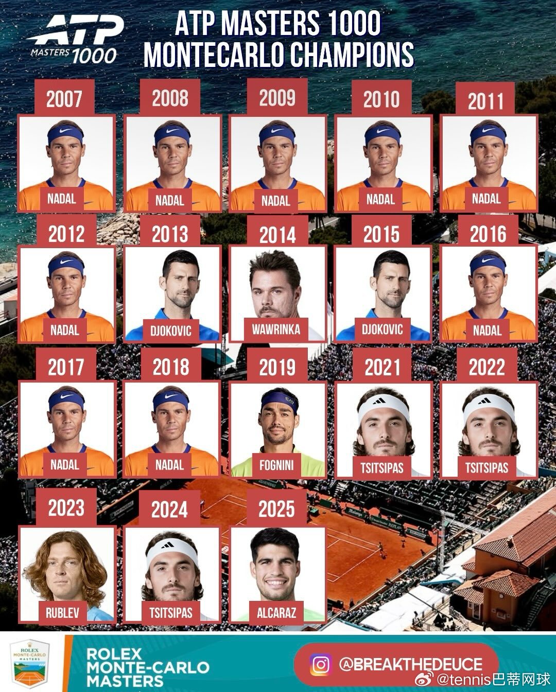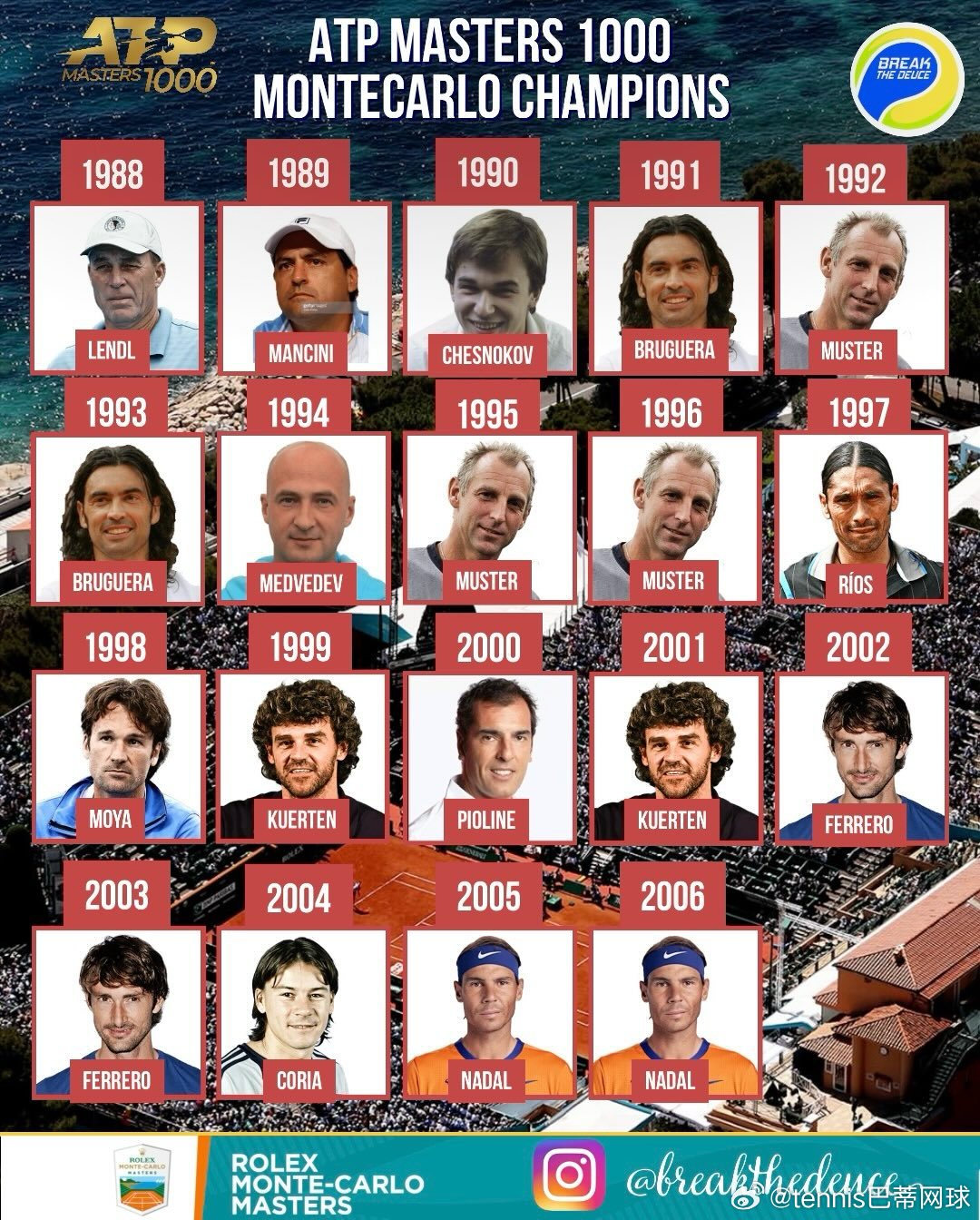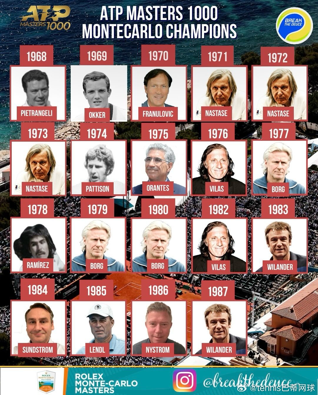 公开赛年年代以来卫冕蒙特卡洛的:纳斯塔塞🇷🇴(1971,1972)比约博格🇸🇪(1979,1980)穆斯特🇦🇹(1995,1996)费雷罗🇪🇸(2002,2003)纳达尔🇪🇸(蒙卡王者🫅)西西帕斯🇬🇷(2021,2022)