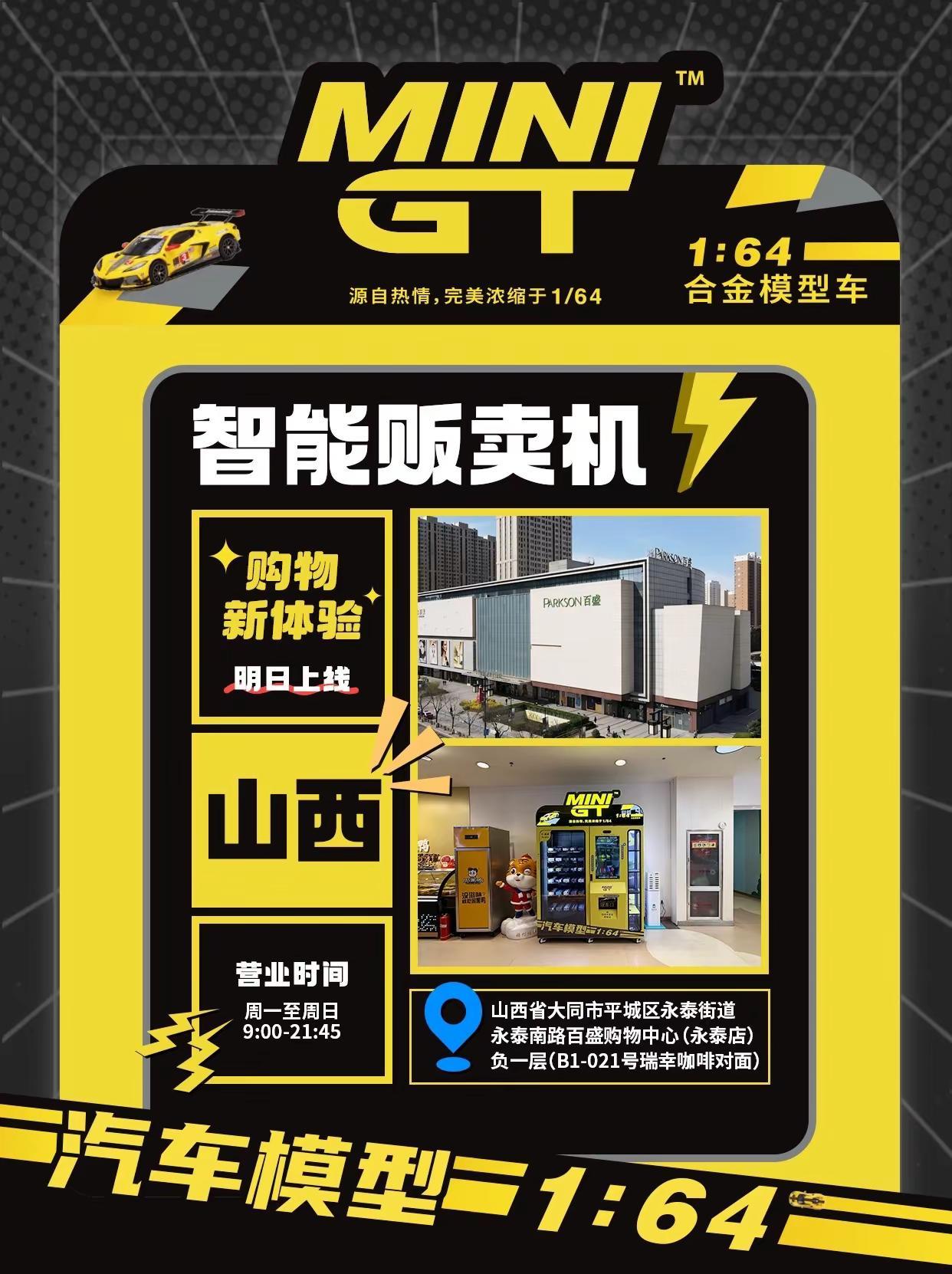 MINI GT 智能贩卖机明日上线成都、大同两台全新贩卖机双城同启在巴适的街头或是古都的城垣旁不妨稍作停留邂逅这份小车惊喜~📍MINI GT智能贩卖机投放点位(具体营业时间见海报)🚗四川@MINI GT贩卖机--成都世豪广场 四川省成都市武侯区天府二街999号世豪广场一层(欧舒丹专柜扶梯旁)🚗山西@MINI GT贩卖机--大同永泰百盛 山西省大同市平城区永泰街道百盛购物中心(永泰店)负一层(B1-021号瑞幸咖啡对面)minigt 汽车模型