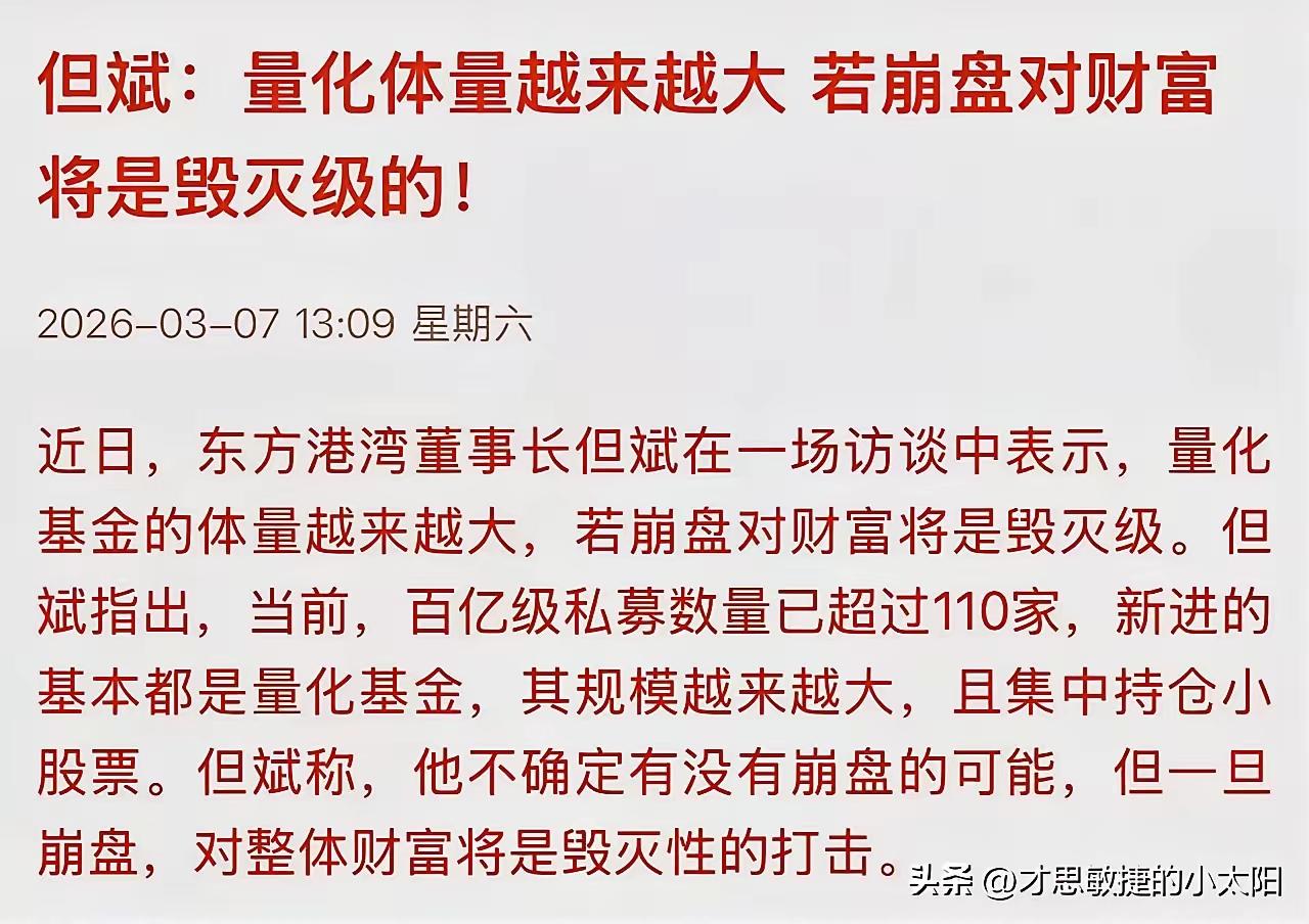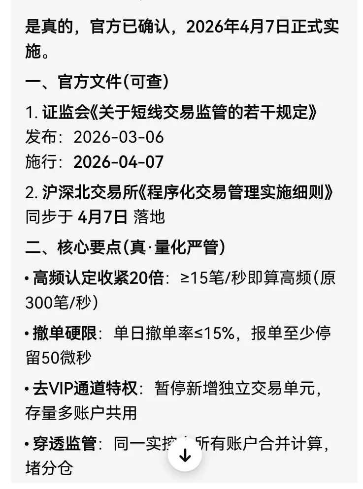 网传,4月7日起,《短线交易若干规定》“量化监管新规”,要从每秒/299下降到每秒/15笔。 不管传言是否真实,量化交易真的是惹得天怒人怨了。散户对此莫不切齿痛恨,只是人微言轻,无可奈何罢了。 连但斌也发文说,量化体量越来越大,若崩盘,对财富将是毁灭级的。