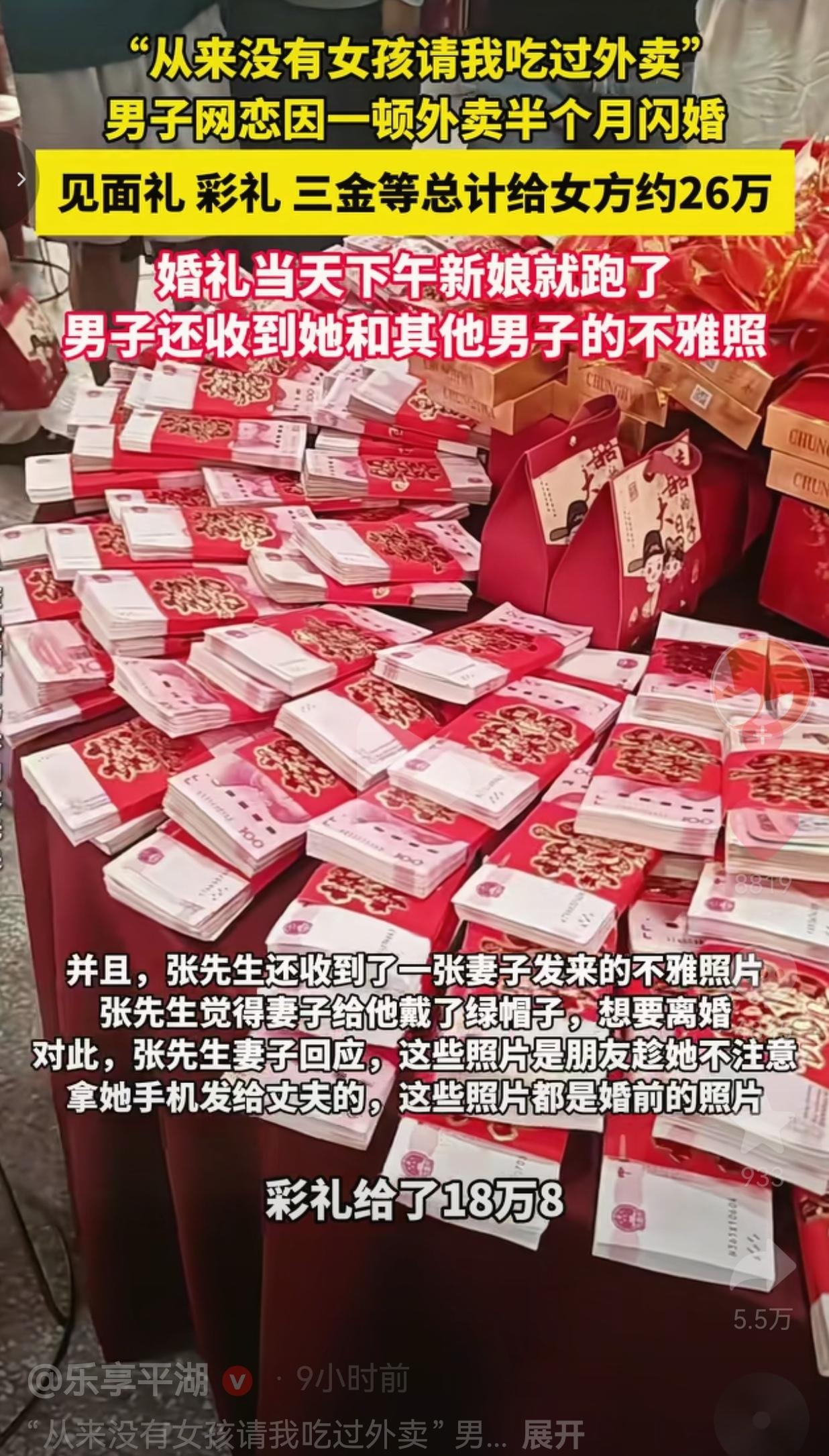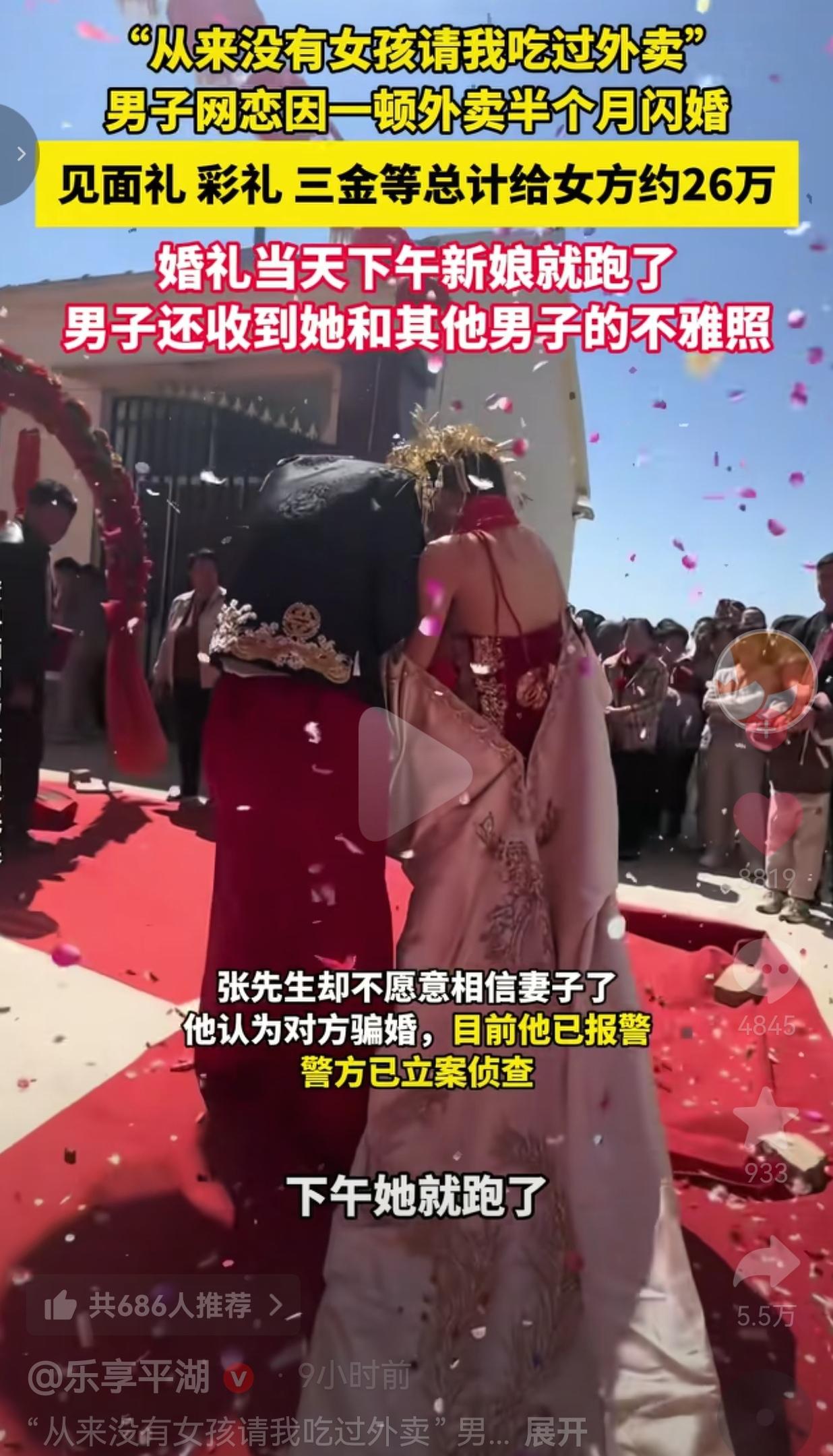 破防了!30多岁大哥因为网恋女友请他吃了顿外卖,半个月闪婚砸26万,结果婚礼当天下午新娘直接跑路,还收到了她和别的男人的不ya照!网友:这哪是结婚,这分明是杀猪盘啊! 河南永城的张先生,今年30多岁了,一直没找到对象,急着成家。去年1月31号,他在微信“摇一摇”附近的人里,认识了一个女孩。 两人聊了没几天就见面了,女孩一见面就主动请他吃了一顿外卖。 张先生当时直接感动坏了,原话就是:“从来没有女孩请我吃过外卖!我吃这外卖都感觉特别兴奋!” 就因为这一顿外卖,张先生直接认定了这个女孩,觉得她就是自己要找的媳妇! 吃完外卖才半个月,张先生就火急火燎地和女孩闪婚了! 为了娶到这个“好女孩”,张先生砸了血本:见面礼1万1,彩礼18万8,还转了6万块当“三金”钱,前前后后加起来,足足给了女方约26万! 婚礼当天,张先生风风光光把新娘娶回了家,结果婚礼刚结束,当天下午,新娘就说“出去买东西”,直接消失得无影无踪! 更离谱的是,当天晚上,张先生还收到了新娘发来的、她和其他男子的不ya照片! 张先生这才彻底清醒,自己这是被彻头彻尾地骗婚了! 他说,婚后也很难见到妻子一面,妻子解释是做直播工作忙,还吐槽张先生不给钥匙、不主动联系,甚至说愿意跟着张先生“你到哪我就跟到哪”,可张先生已经彻底不信了。 目前张先生已经报警,警方已经立案侦查。 网友评论直接炸锅,全是怒其不争的大实话! 有的网友说:我真的服了!一顿外卖就把你收买了?30多岁的人了,一点心眼都没有?半个月闪婚,26万打水漂,这不是活该是什么? ​ 也有的网友说:急着成家也不能疯啊!网恋认识的,一顿外卖就感动得稀里哗啦,人家就是抓住你这种缺爱的心理骗钱!这女的就是专业骗婚的! ​ 还有的网友说:26万啊!多少人打工多少年才能攒下的钱!就这么被一顿外卖骗走了!看着都心疼,又气又急! ​ 更有甚者直接说:典型的杀猪盘+骗婚!先给你点小甜头(一顿外卖),让你放下戒心,然后疯狂要彩礼,婚礼当天卷钱跑路!专门骗这种大龄未婚、缺爱的男性! 说实话,我看完这事儿,真的是又气又急,哀其不幸怒其不争! 30多岁的人了,活了大半辈子,怎么就被一顿外卖给冲昏了头脑? 人家就是抓住了你“大龄未婚、从来没被女孩善待过、缺爱”的弱点,用一顿几十块钱的外卖,就换来了你26万的血汗钱! 你以为是爱情来了,其实是骗子来了!你以为是女孩对你好,其实是人家在给你下套! 半个月闪婚,连对方人品、家底、婚史都没搞清楚,就敢砸26万彩礼?你这哪里是结婚,你这是给骗子送钱! 最离谱的是,婚礼当天新娘跑路,还发不ya照羞辱你,这已经不是简单的骗婚,这是赤裸裸的诈骗、侮辱! 那些说“大哥太单纯”“太可怜了”的人,我想说:可怜之人必有可恨之处! 天上掉馅饼的事儿能信吗?一个刚认识的女孩,平白无故对你好,请你吃外卖,不是图你的钱,难道是图你老实好骗吗? 就是因为有太多这种急着成家、失去理智的人,才养肥了这帮骗婚的骗子! 26万不是小数目,是父母一辈子的积蓄,是你自己多年的血汗,就这么被人骗走,你对得起谁? 现在报警立案,能不能把钱追回来都是未知数,就算追回来,这婚结的,脸都丢尽了! 我们总说,成家是人生大事,可再急,也不能急着把自己往火坑里推! 爱情从来不是一顿外卖就能换来的,婚姻更不是闪婚就能圆满的! 骗子最擅长的,就是抓住你内心的缺口,用最小的成本,换取最大的利益。 你以为的温暖和善意,可能全是精心设计的骗局;你以为的命中注定,可能只是人家的赚钱工具。 大龄未婚从来不是耻辱,为了结婚而结婚,才是对自己最大的不负责! 擦亮眼睛,守住钱包,永远不要因为缺爱,就给骗子可乘之机! 最后,我想说的是:一顿外卖换不来真心,闪婚换来的只有陷阱!别让你的缺爱,成为骗子骗钱的工具!