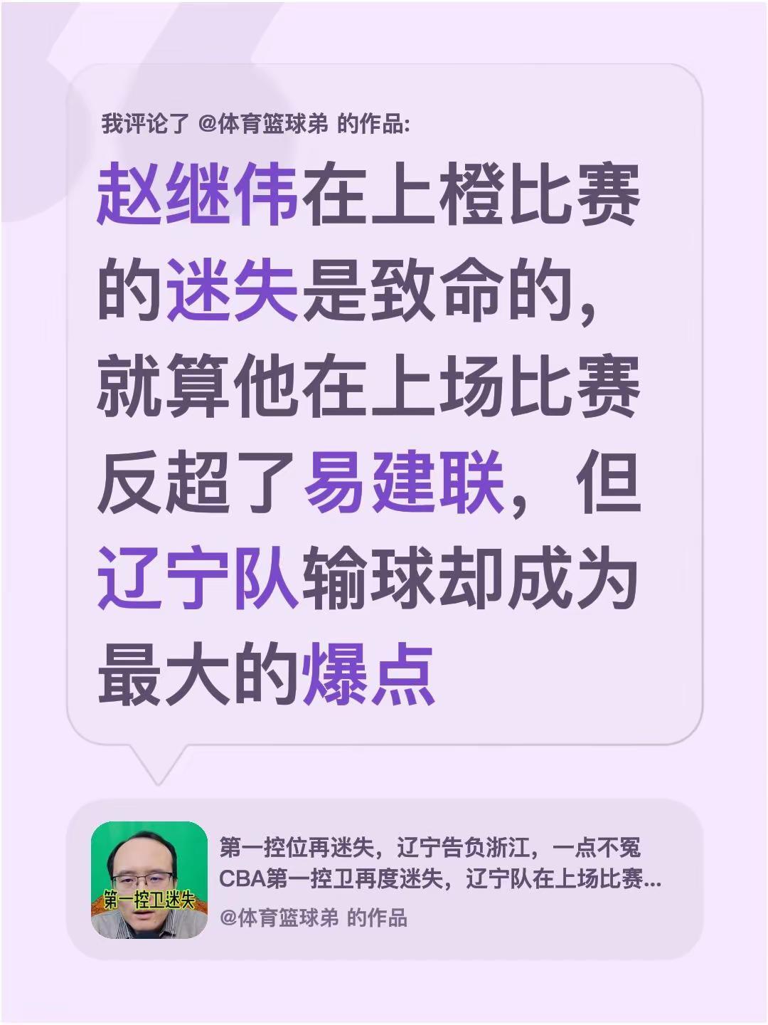 我评论了@体育篮球弟 的作品:赵继伟在上橙比赛的迷失是致命的,就算他在上场比赛反超了易建联,但辽宁队输球却成为最大的爆点