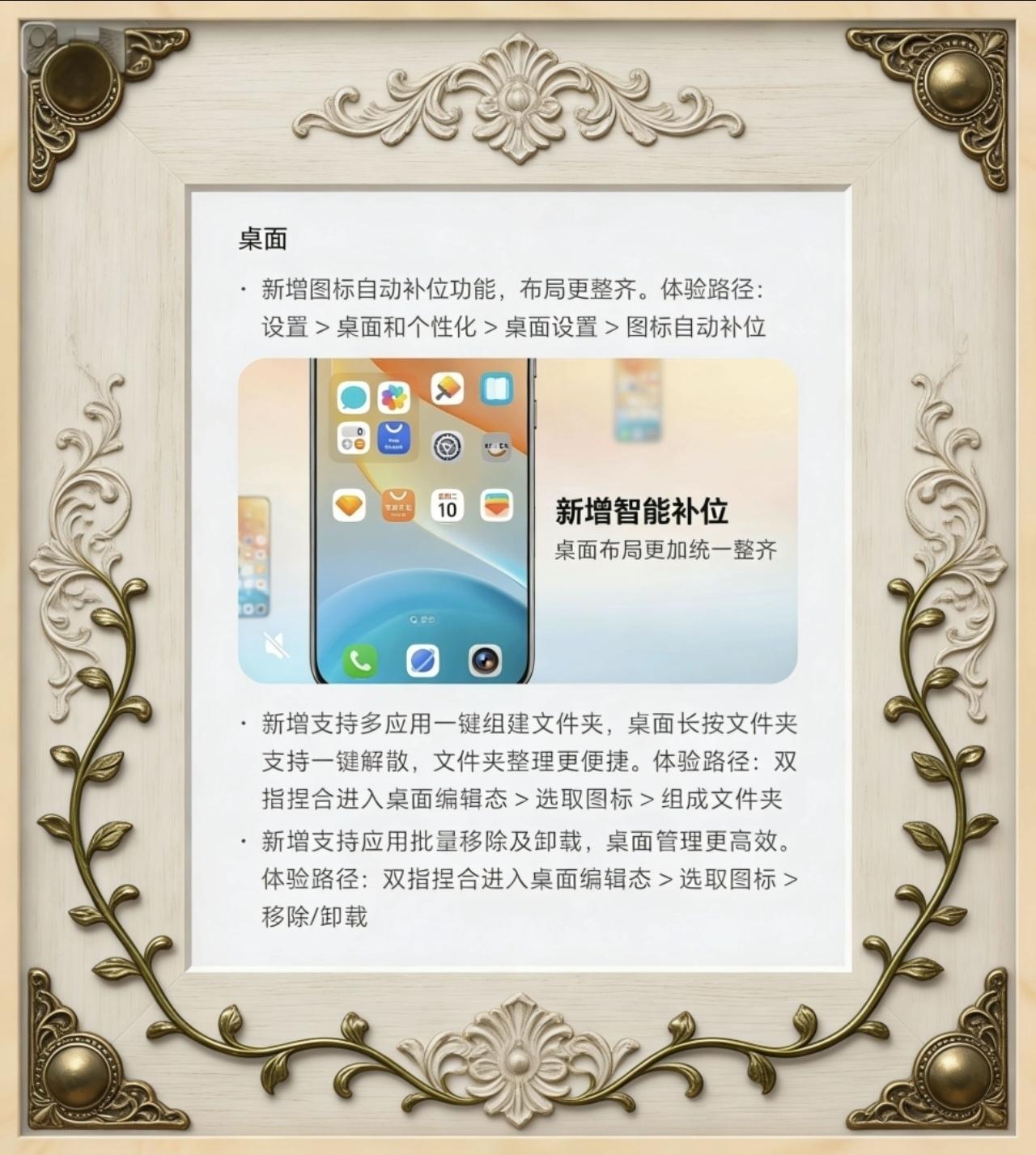 荣耀magic7pro版本新增了图标自动补位功能! 手机屏幕有些时候一不小心就把桌面弄得乱七八糟,或者图标拉的到处都是,想要对齐还得一个一个去拉,这对于某些喜欢屏幕整洁清爽的人来说,这个是没办法接受的,我自己就这样,只要屏幕上一有个空格,我总会去拉一个应用图标填满,不知道是否有和我一样的小伙伴。 不过在最新版本magicOS 150版本中,荣耀增加了图标自动补位功能,这样一来就不用我们去一页一页对齐图片了,除此之外还增加了一键组建文件夹,APP批量移除或者卸载,反正是怎么方便怎么来!对此不知道小伙伴们认为这些功能对你们有用吗?