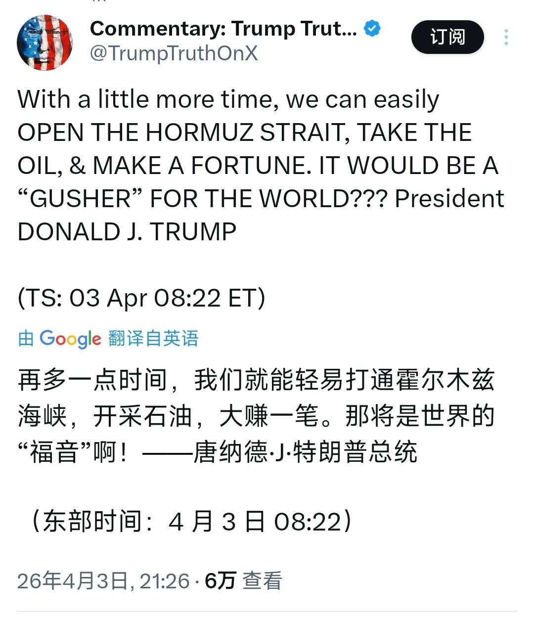 特朗普昨晚(北京时间4月3日晚)发文写道:“再多一点时间,我们就能轻易打通霍尔木兹海峡,开采石油,大赚一笔。那将是世界的‘福音’啊!” [机智]评几句:特朗普又赢麻了。特朗普这番口出狂言的表态,又是一场毫无底线的吹牛闹剧!明明美军在伊朗战场损兵折将、深陷僵局,霍尔木兹海峡被伊朗掌控且持续对美国及其盟友关闭,他却大言不惭称能轻易打通海峡、开采石油赚大钱,甚至厚颜无耻将这场资源掠夺标榜为世界“福音”。特朗普满嘴跑火车的背后,不过是用虚假幻想掩盖军事失利的窘迫,用石油野心粉饰霸权掠夺的本质。